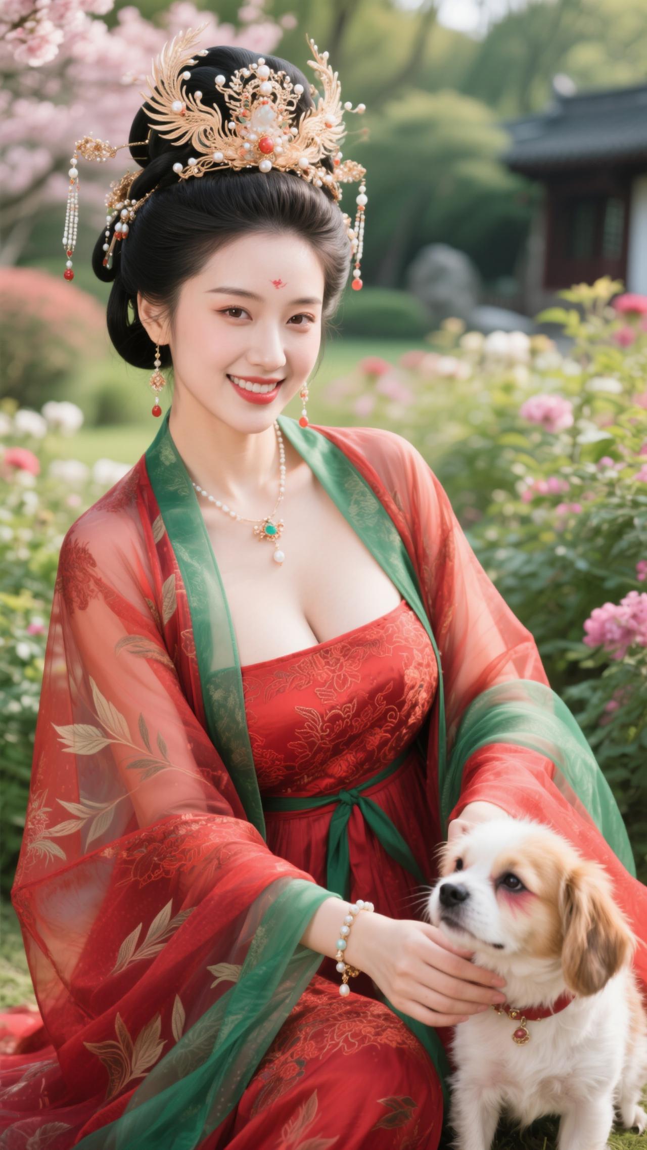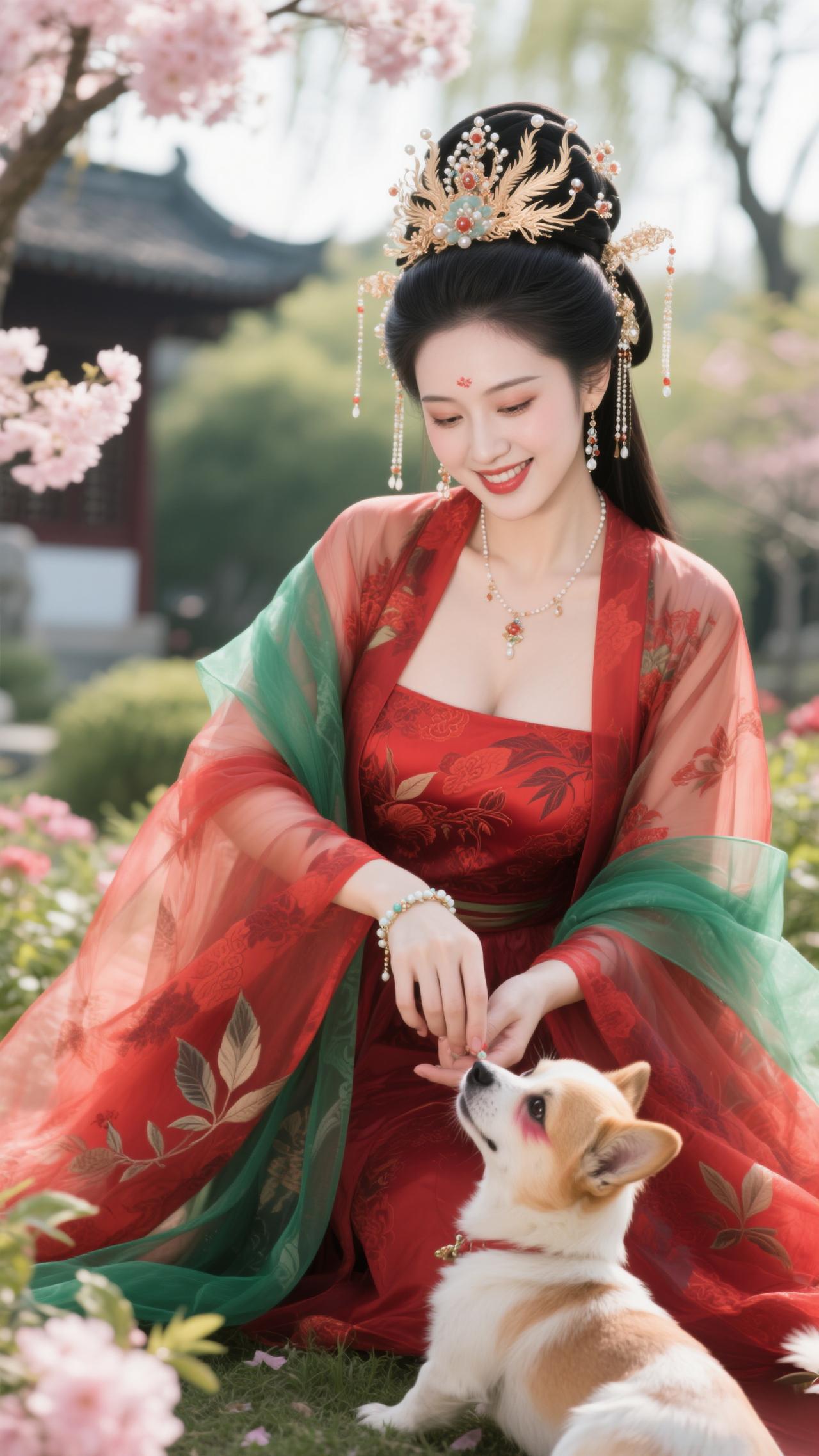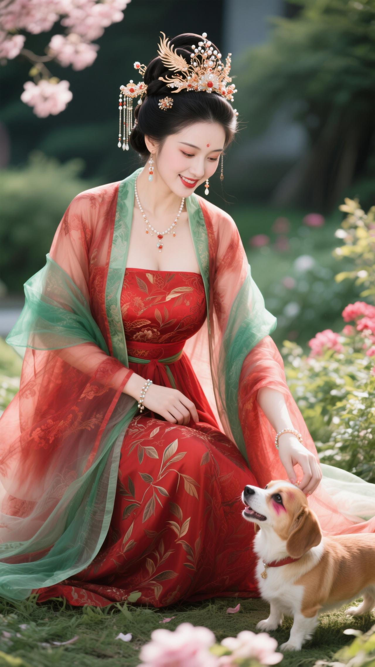 《南歌子·红妆戏犬》 樱雪飘金钿,红妆映绿纱。 戏将花影逗萌娃(犬),软尾轻摇偷舔、指尖霞。 笑靥凝春露,芳襟惹絮华。 满园晴色共欢哗,懒把琵琶轻抱、醉桃花。
