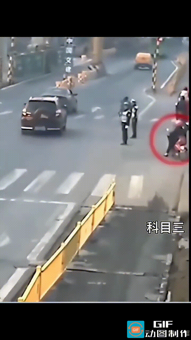 这位女士,你回头看看这段视频,你就会知道,帽子叔叔是你的再生父母,正是他这用力一拽,才将你从鬼门关拖了回来。 难道是因为头盔压得太低,遮挡了视线,才让你做出错误的判断。 看完视频,会不会有种大难不死的庆幸感,对将你从鬼门关拽回来的帽子叔叔,是不是该送一面锦旗。 可能看了视频,你也不一定服气,你心里一定在说,如果他不拽的话,我早就过去了。 如果真是这样的想法,那你下次一定会得偿所愿。 大车司机被惊出一身冷汗,看看路上那两道醒目的刹痕,就知道司机被吓得不轻。 你自己想不开就算了,可别连累他人啊。 多亏了眼疾手快的帽子叔叔,手劲儿还挺大,才避免了两家悲剧。 好人一生平安。
