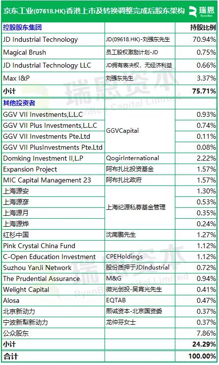 招股书显示,京东工业,其在香港上市、以及转换调整*完成后的股东架构中,刘强东先生,通过京东集团(09618.HK,JD.NASDAQ)、MaxI&PLimited等实体,合计控制约75.71%的投票权。