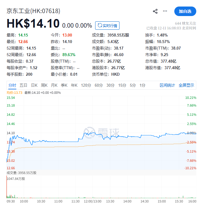 截至首日(12月11日)收市,京东工业(07618.HK)每股收报14.10港元,不涨不跌,目前总市值约377.48亿港元。