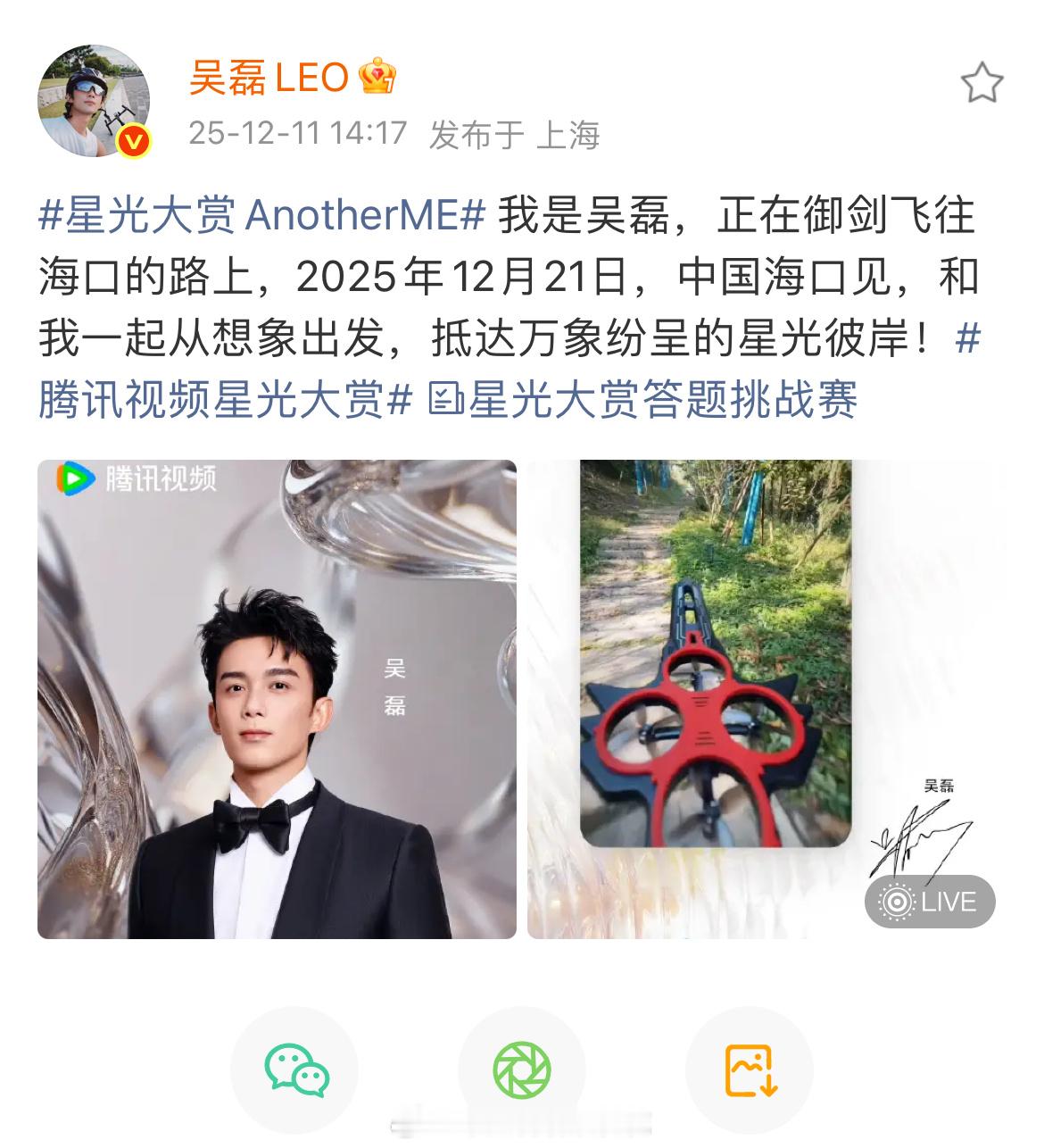 吴磊御剑飞往星光大赏🆘吴磊🐧星光大赏AnotherME活动是一段御剑飞行视频,磊子是在现在御剑出发,十天后到达现场嘛hhhhh,脑子里除了演戏剩下的全是抽象了吧! 吴磊正在御剑飞往海口的路上