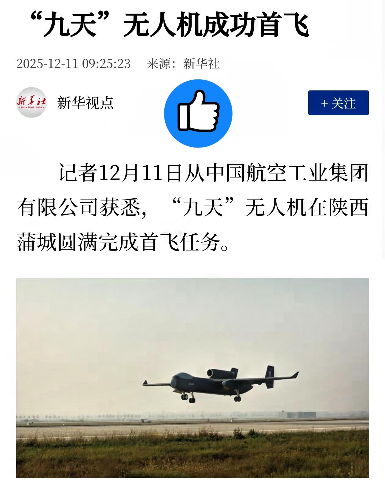 “九天”无人机首飞成功! 大家可能不知道,“九天”无人机有多恐怖? 最大飞行高度15000米,最大飞行时速700公里,最大航程7000公里。 最大起飞重量16吨,最大载弹量6吨。 更关键的是,8个外挂点既可以挂载1000公斤级的制导炸弹。 如此强大的轰炸能力,完全不逊色于一票轻型中型战斗机! 这可不是普通无人机的升级,是中国大型无人机技术的质的飞跃,12月11日在陕西蒲城圆满首飞,每一个数据都透着硬核实力,狠狠彰显了咱们的军工底气。 光说载弹量6吨就够震撼了,对比下美国主流的MQ-9“死神”无人机,载弹量才1.7吨,“九天”直接碾压,差距大到肉眼可见,这就是咱们的技术硬实力。 它的动力是涡扇发动机,能兼顾高速和长航程,12小时以上的航时,7000公里的航程,能轻松覆盖远海纵深,长时间盘旋待命,作战续航力拉满。 8个外挂点藏着大能耐,不光能挂重型制导炸弹,还能挂霹雳-12E空空导弹、反舰导弹,甚至电子战吊舱,既能进攻打击,又能干扰防御,生存力超强。 最颠覆的是机腹的“异构蜂巢任务舱”,能装几百架微型无人机或巡飞弹,堪称“空中无人机航母”,把小型无人机的作战半径短板彻底补齐。 这些微型蜂群能自主组网,0.3秒就能完成目标排序,发起饱和攻击,让敌方防空系统顾此失彼,拦截成功率直接从98%骤降到37%,杀伤力拉满。 它还有模块化设计buff,两小时就能切换任务舱,既能当轰炸机、蜂群母舰,又能搞运输空投、应急救援,军用民用通吃,实用性直接拉满。 全身国产化率超90%,从芯片到飞控系统全是自主研发,不用看别人脸色,技术自主可控,这才是最踏实的安全感,硬核又靠谱。 它的出现直接改写了无人作战规则,从单一平台对抗变成体系化智能作战,外媒都慌了,五角大楼都把它列为最高威胁级别,承认在蜂群技术上落后咱们。 这不仅是一款装备的突破,更是新质生产力的体现,带动无人机产业链升级,不管是国防安全还是低空经济,都能注入强劲动力,意义重大。 咱们的无人机技术早就不是追随者了,现在妥妥的引领者,“九天”的首飞就是最好的证明,每一个亮点都藏着大国匠心,让人热血沸腾。 各位读者你们怎么看?欢迎在评论区讨论。