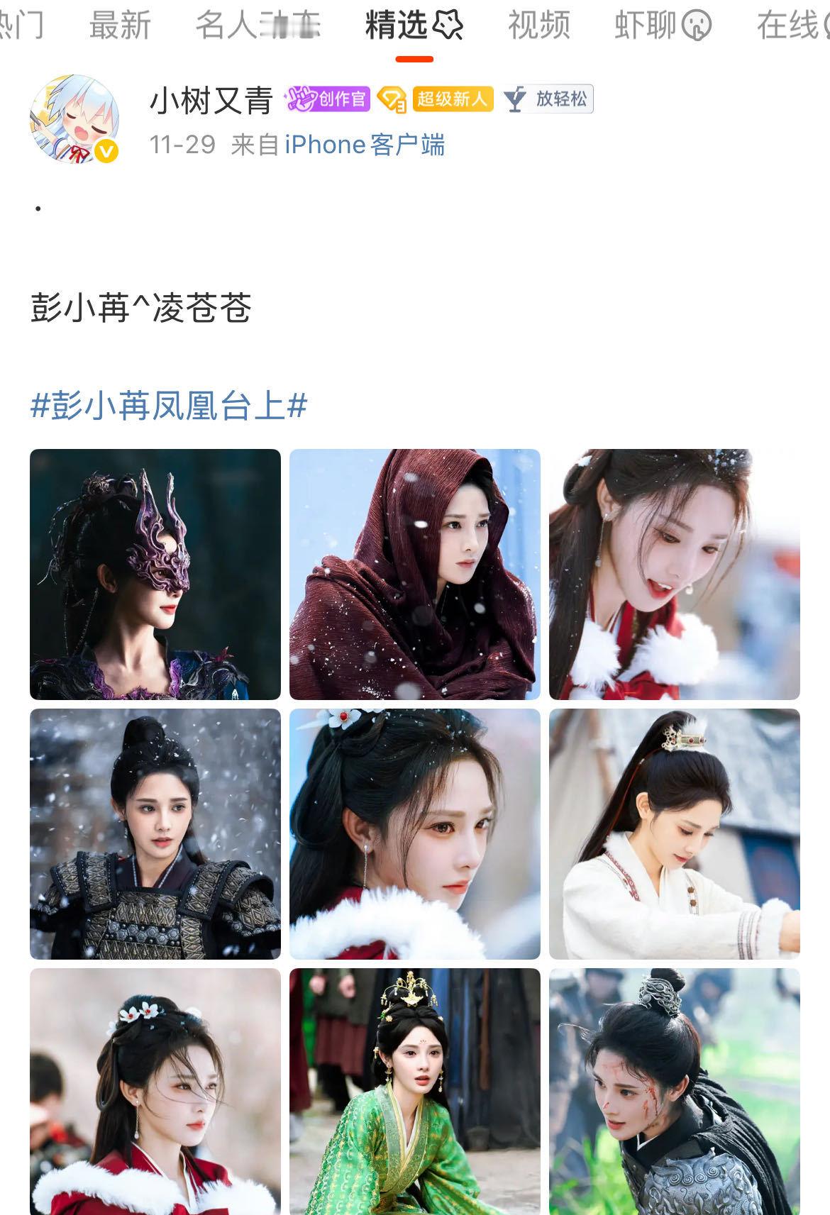 彭小苒超话金超 喜大普奔!彭小苒超话正式升级金超!这份荣耀全靠作品硬实力加持,《暗河传》里冷艳带感的慕雨墨吸粉无数,《凤凰台上》飒爽果敢的凌苍苍成功出圈,双剧连播直接霸屏古装赛道。超话里二创、角色讨论刷屏,粉丝热情满满,这是作品与热爱的双向奔赴,未来继续为演员彭小苒打 call!