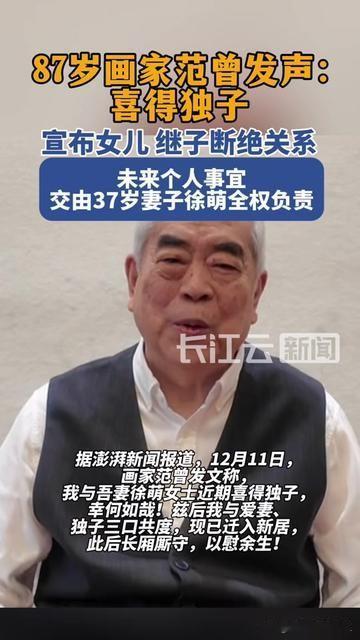 我揉了揉眼睛确认三遍,87岁画家范曾说“喜得独子”,不是抱孙子,竟是自己生的亲儿子? 我们小区张叔60岁抱着孙子逛公园,逢人就笑“熬到退休享清福”,可范曾都87了,得从头学换尿布、陪孩子读绘本。 这“喜”里藏着多少普通人不敢想的“难”啊! 咱们30岁养娃都喊“辅导作业要心梗”,87岁要陪孩子走18年成长路,钱能请保姆、找老师,可“爸爸陪你跑操场”“爸爸参加家长会”这些日常,哪是钱能解决的? 有人说“有钱就能养”,有人说“老来得子是福气”,但我突然懂了,当父母的“喜”从来不是光靠“宣布”就行,那些没说出口的“怕”(怕陪不到孩子长大)、“累”(累得扛不动孩子)、“盼”(盼着能多陪一天),才是最真实的人心。 如果是你,87岁会选择要孩子吗?是羡慕这份“晚来的福”,还是觉得“责任比喜重多了”?
