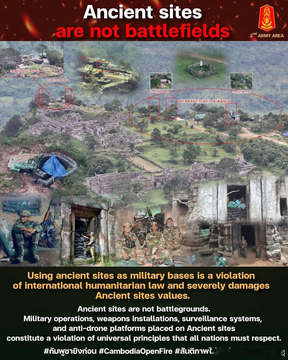 泰国陆军称柬埔寨利用寺庙进行军事行动,泰国的武装回应属于正当行为 泰国皇家陆军(RTA)为其近期的军事行动辩护,称柬埔寨蓄意利用包括塔桂寺和柏威夏寺在内的文化遗产地作为基地和武器阵地,攻击泰国军队。温泰·苏瓦里少将表示,这种行为导致这些遗址暂时失去了1954年《海牙公约》的保护,该公约通常在武装冲突期间保护文化财产。柬埔寨文化部谴责泰国的袭击“不道德”且破坏历史遗产,并敦促联合国教科文组织和东盟进行干预。泰国皇家陆军则坚持认为,证据表明柬埔寨军队利用这些寺庙进行军事行动,包括储存弹药和进行监视,因此泰国的回应既符合比例原则,也符合国际规则。温泰少将强调,柬埔寨将文化遗址军事化违反了国际准则,泰国有权自卫。