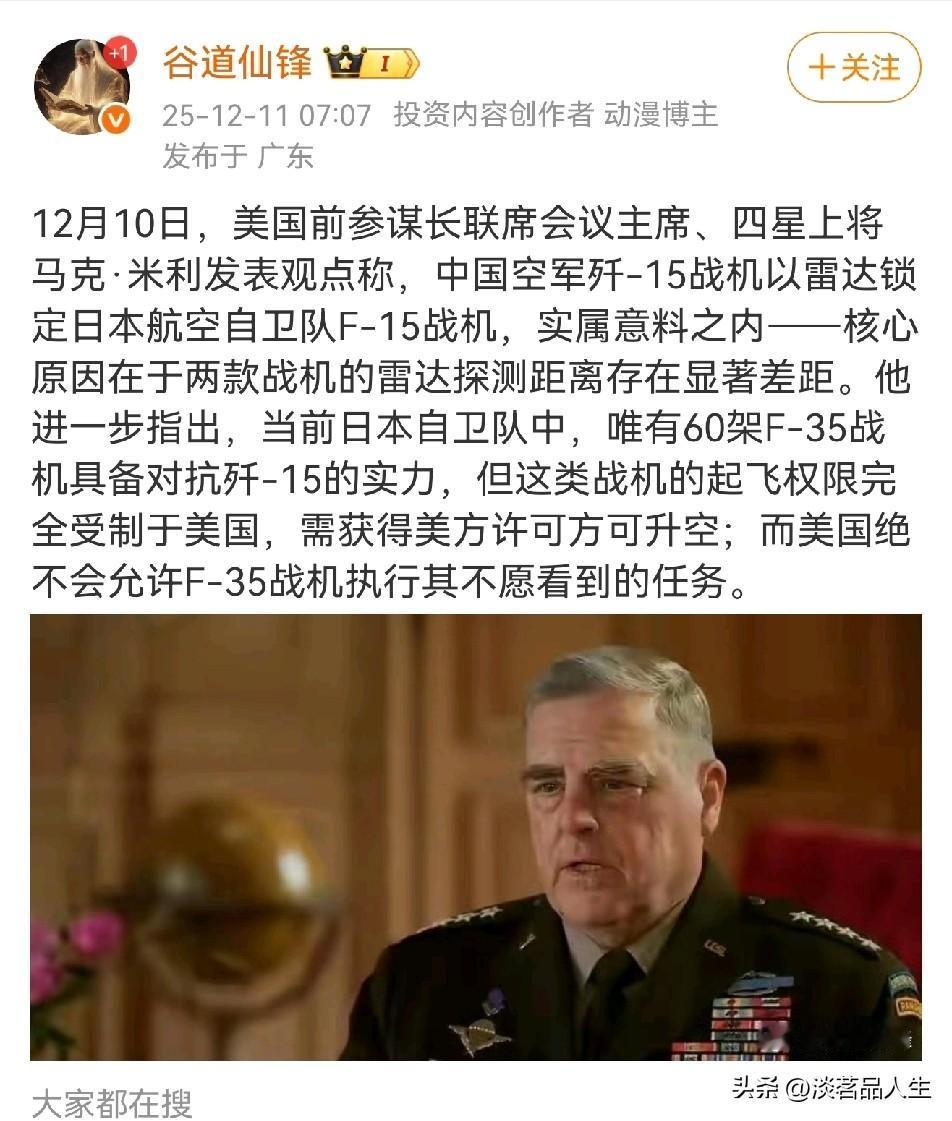 这位美军将领关于F-15被歼-15锁定的分析,最后一句话最有意思,他怕的是什么。 美军前参谋长联席会议主席、四星上将马克·米利称,歼15锁定F-15是意料之中的事,因为双方的雷达探测距离有明显差距。当前的日自卫队中只有60架F-35有对抗歼-15的能力,但这款飞机起飞权限在美国,需获得美方许可才能升空,但美国绝不允许F-35战机执行他们不愿意看到的任务。 最后一句话是不是很有意思,面对歼-15的时候,F-35有对抗实力为什么不能升空,有什么他们不愿意看到的结果。难道F-35的雷达根本不能和歼-15抗衡,升空就会被锁定,还是肯定会被F-15击落,那样是不是太丢人了。