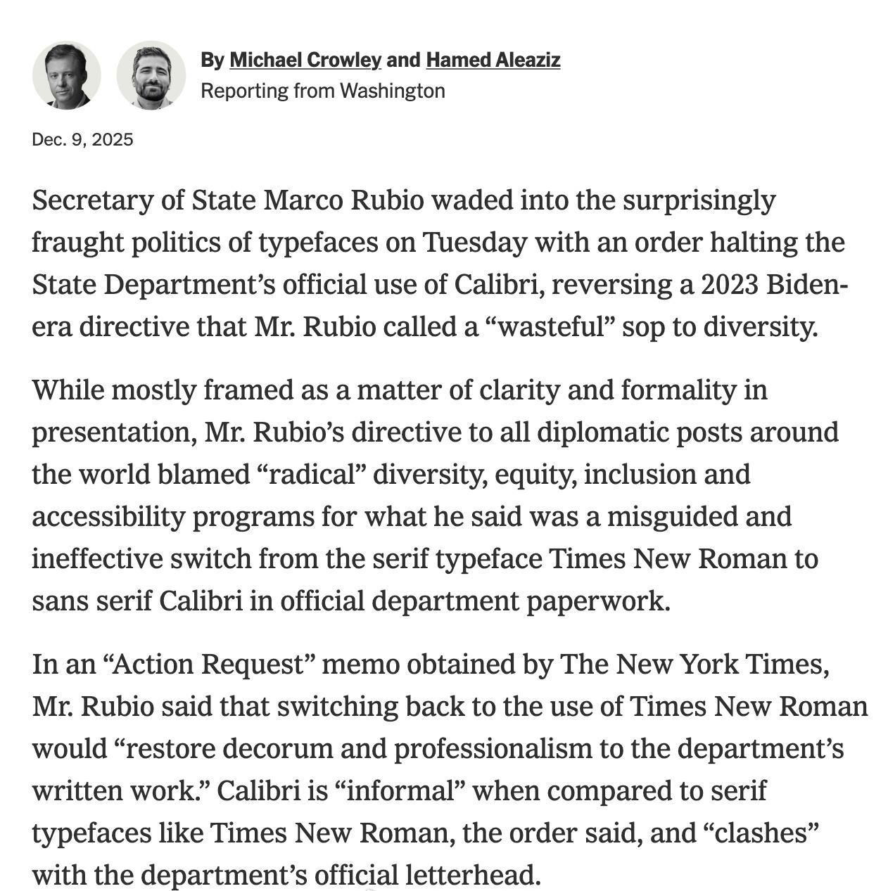美国国务院最近换了字体,这事儿吵得挺热闹。 简单说,新上任的国务卿卢比奥下了一道命令:从12月10号起,所有官方文件和外交电报,不许再用Calibri字体了,必须统一换回Times New Roman。这个决定,直接把前国务卿布林肯两年前的规定给推翻了。 为什么换个字体能闹出这么大动静?因为两边理由完全对立。 当初拜登政府换用Calibri,主要是出于实用和包容的考虑。他们认为这种字体线条简洁,没有多余的装饰笔画,对视力不好或者有阅读障碍的人来说,看起来更轻松。而且Calibri是微软Office的默认字体,用起来也方便。这被看作是推动政府文件更“无障碍”的一项小改革。 但卢比奥和他的团队不这么看。他们批评Calibri字体看起来“太随意”,像学生作业或者科技公司的广告邮件,损害了外交文件的严肃和权威。他们认为换回Times New Roman,是回归一种“古典的仪式感”,这种带装饰笔画的字体源自古罗马传统,显得更正式。卢比奥更把之前的字体改革,直接称为“浪费资源的多元化项目”,认为这是“激进的政治正确表演”,并没有真正帮到谁,反而降低了效率。 所以,这远远不止是选Arial还是选Times New Roman那么简单。它成了美国当下政治斗争的一个微型战场。一边认为字体选择应该体现包容性和实际效用;另一边则将其视为恢复传统、反对所谓“觉醒文化”的象征性举动。 这个变化让不少外交官感到无语。在全球危机不断的档口,高层却在操心大家用什么字体写报告,有人觉得这简直是“微观管理”到了荒唐的地步。设计圈也有反应,Calibri字体的原创设计师就公开表示,卢比奥的理由“令人遗憾”。 当然,实际的影响也很具体。全球的美国使领馆都得连夜修改他们的文件模板,这中间耗费的时间和行政资源,也是实实在在的成本。 一场字体风波,折射出的是深刻的理念分裂。当“专业性”的定义本身成为党争的筹码——一方将其锚定于传统的视觉权威,另一方则绑定于普惠的实践——那么哪怕是文档里一个最小的字母,也难免被卷进意识形态的漩涡里。最终为此买单的,或许是政府的运行效率,以及那些本该被照顾到的群体。美国务卿卢比奥