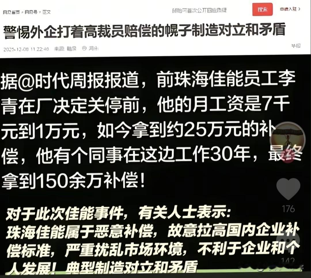 学到了一个新词汇“恶意补偿”,我们要严格警惕外企打着裁员高补偿的幌子制造矛盾和对立,这属于恶意补偿,故意拉高国内企业补偿标准,严重扰乱市场环境,不利于企业和个人发展。