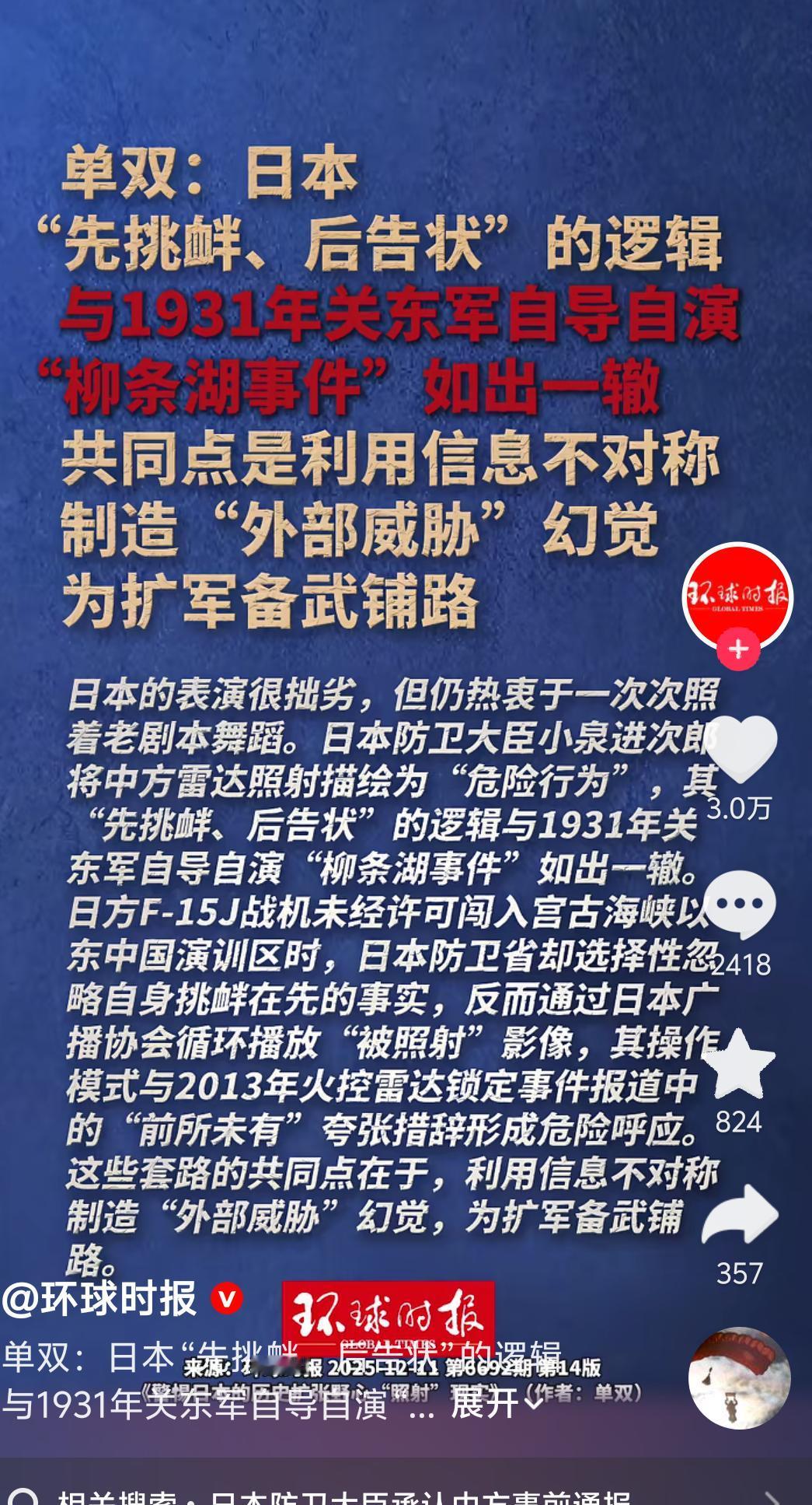 日本“先挑衅后告状”的把戏又上演了!这逻辑和1931年“柳条湖事件”如出一辙,都是靠信息不对称制造“外部威胁”幻觉,为扩军备武铺路。从F-15闯台海反泼脏水,到炒作雷达照射,日本这套“贼喊捉贼”的操作,野心藏都藏不住!历史教训在前,咱们可别被忽悠了!日本涉台战略 日本想再侵略