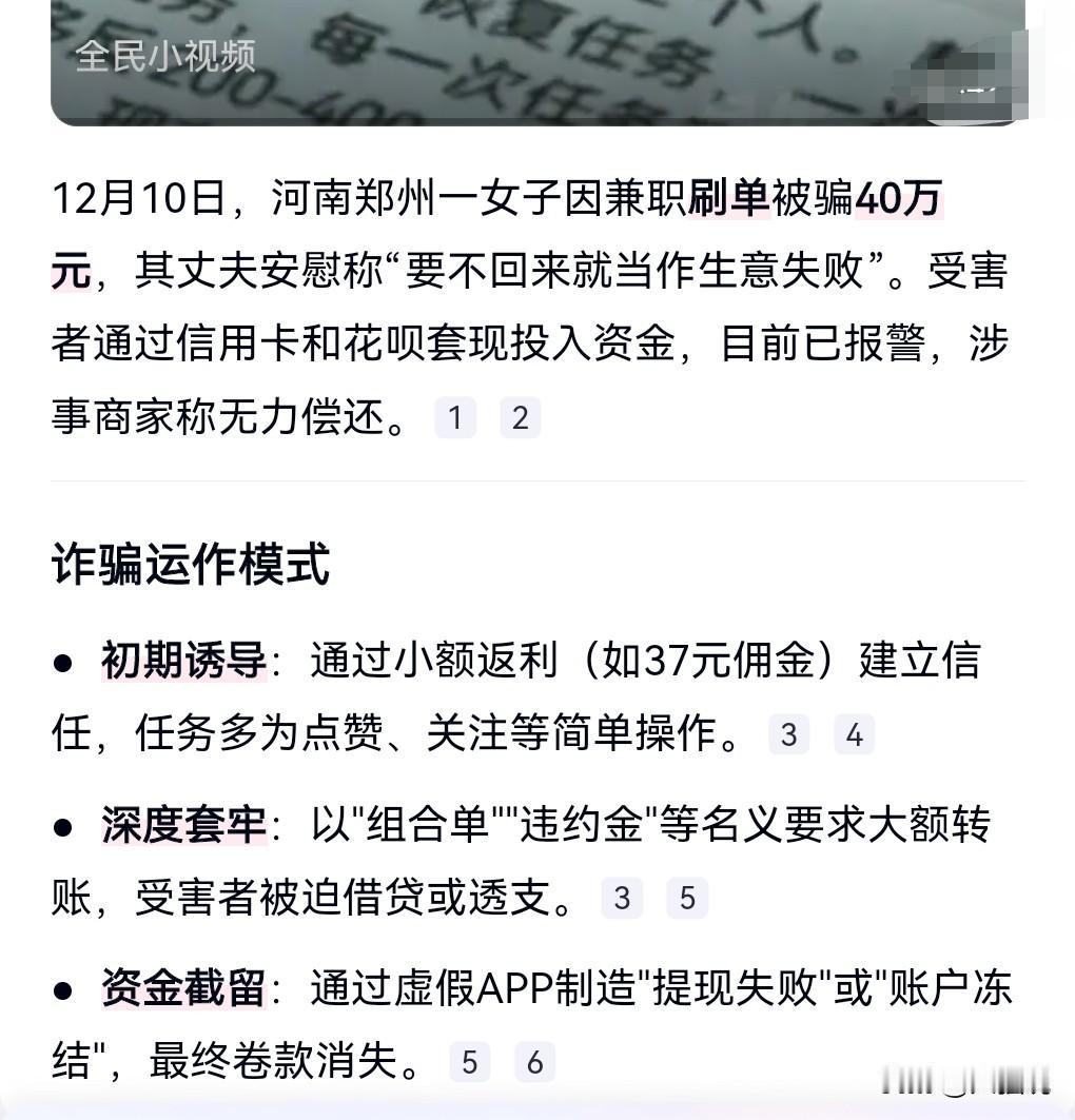 别再傻傻的相信刷单赚钱了。 12月11日在网上看到这么一起案件。 女子兼职刷单一年被骗40万崩溃大哭。 女子的丈夫还是挺爱这个老婆的,心态挺好的,说要不回来就当是做生意失败了。 这种骗局都会先给一点点甜头,等到被骗者投入大量资金,骗子便会卷款消失。