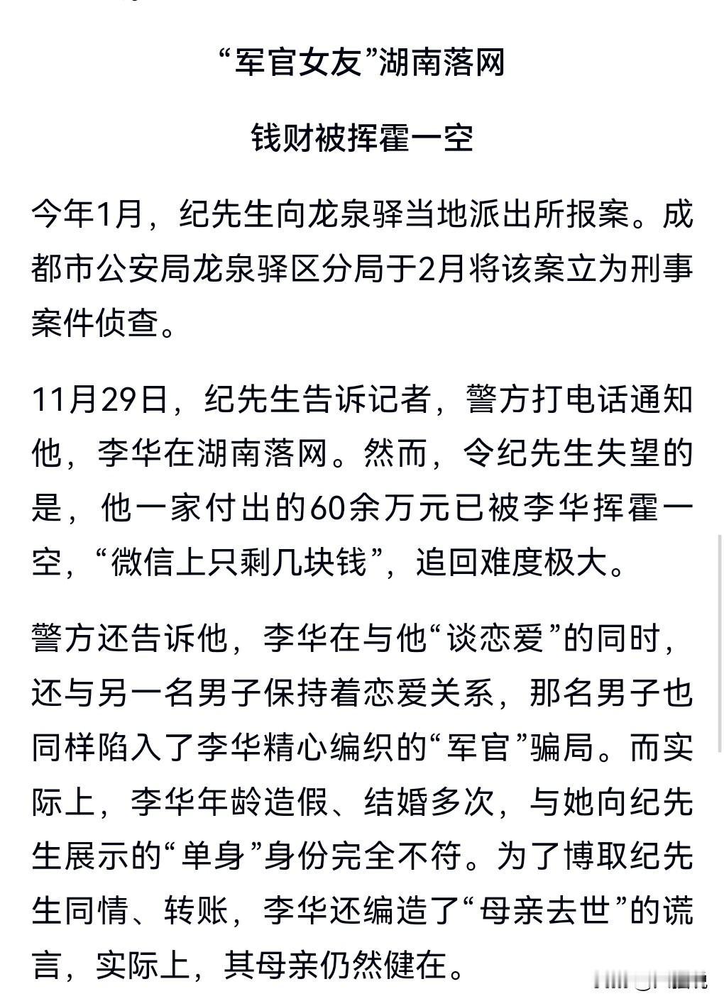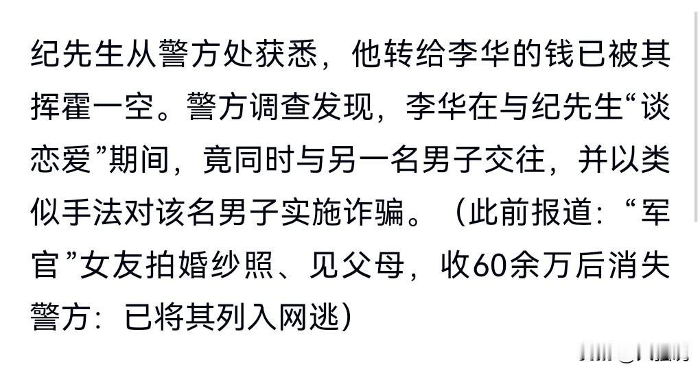 经常有男子冒充军官诈骗女性的钱财。 这下我开眼了,竟然有女人冒充军官诈骗男性的钱财。 造成男方损失60多万。 男的希望女的坐牢,更希望她还钱,但钱都被这女人花光了,这也太能花了吧。 舔狗舔狗,舔到最后一无所有啊。 这女人不仅骗他,而且还在骗另一个在交往的人。 等待这个女人的将是法律的严惩。