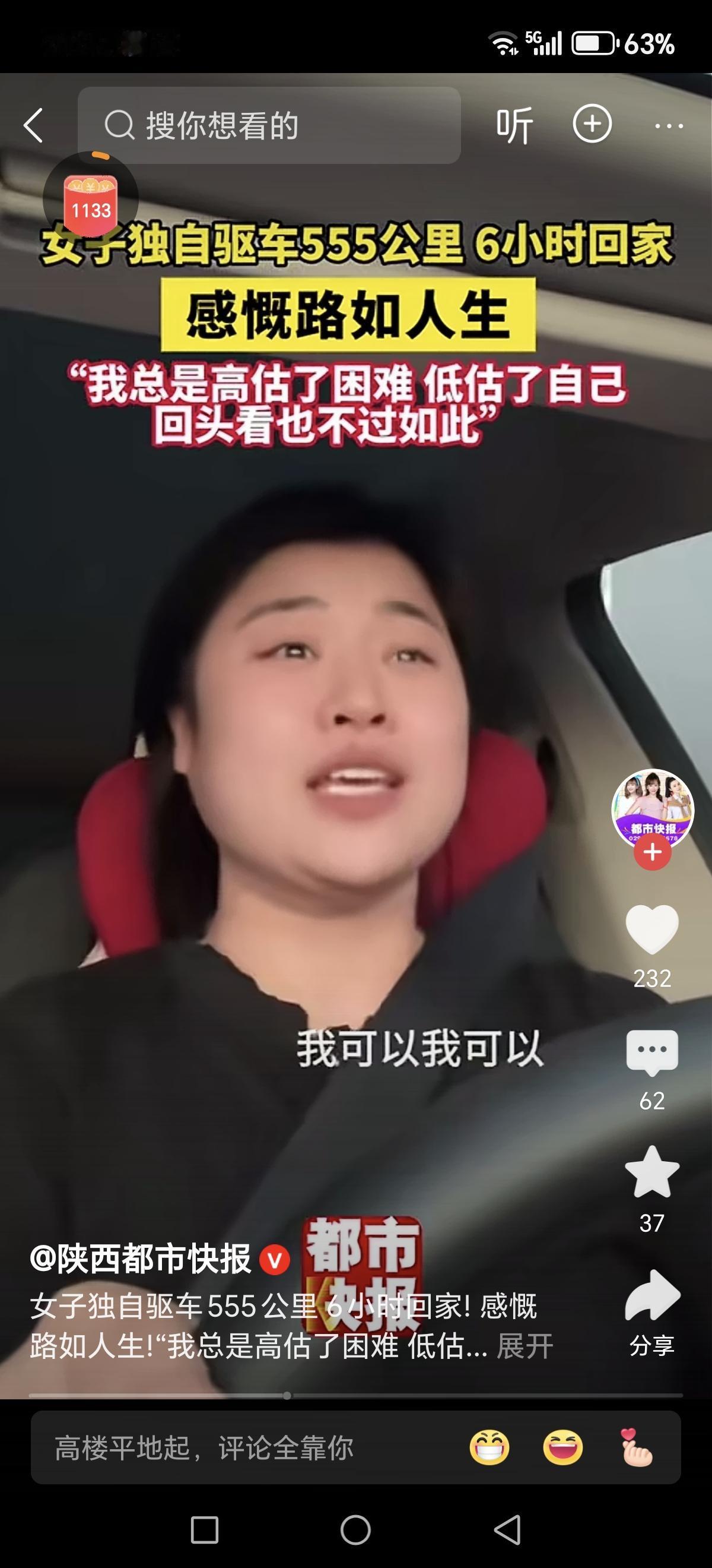 这位女子独自驾驶555公里,耗时6小时平安归家的故事,真是一段令人动容的旅程,也是一场关于勇气与自信的深刻人生启示。 在长途跋涉中,她或许遇到了各种挑战:复杂的道路、突如其来的天气变化、身体的疲惫……但她坚持了下来,最终安全抵达。她用自己的行动告诉我们:困难总是被我们高估了,而真正的力量,往往低估了自己。 “我总是高估了困难,低估了自己,回头看也不过如此。”这句话非常通透,像是一面镜子,照出了许多人在面对挑战时的心态。我们常常被困难吓得退缩,担心自己无法应对,但当我们真正走过那段路,回头看时,却发现,自己比想象中更坚强、更勇敢。 这正如人生的旅途:困难像风暴,总会来袭,但只要有信念和勇气,坚韧不拔,就能闯过一切。每一次的坚持,都是一次自我超越;每一次的克服,都是对自己能力的肯定。就像她的旅程,虽长但平安归来,正是对内心力量的最佳证明。 她的故事提醒我们:不要轻易被困难吓倒,也不要低估自己拥有的潜能。人生路上,难免会遇到风雨,但只要我们勇敢前行,终究会发现,风雨过后,天会更蓝。 这也让人深思:在面对生活的种种挑战时,我们是否也像她一样,敢于迈出第一步?是否相信,自己有足够的力量去应对一切?只要心怀信念,勇敢面对,路就会变得更加宽广。 愿我们都能像她一样,勇敢驾驶人生的汽车,迎着风雨,驶向属于自己的那片晴空。一个人开车的路 旅途感悟