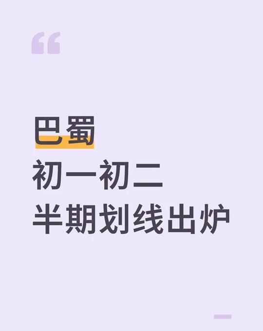 巴蜀初一初二半期划线 1⃣ 初一 A等标准:三校拉通排名,前700名。 单科A等划线: -语文:110分 -数学:130分 -英语:140分 2⃣ 初二 单科A等划线: -语文:115分 -数学:117分 -英语:128分 -物理:86分 重庆教育 重庆家长 重庆中学 重庆七龙珠 巴蜀中学 期中成绩 期中排名