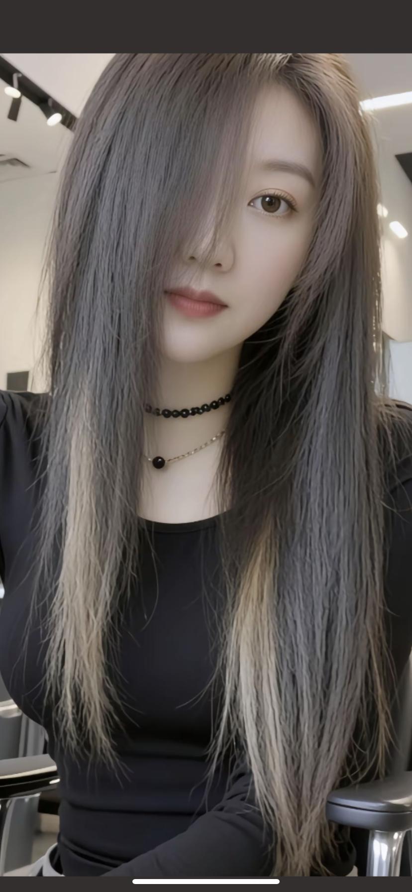 自然垂落的灰色长发,搭配黑色上衣,简约而优雅。