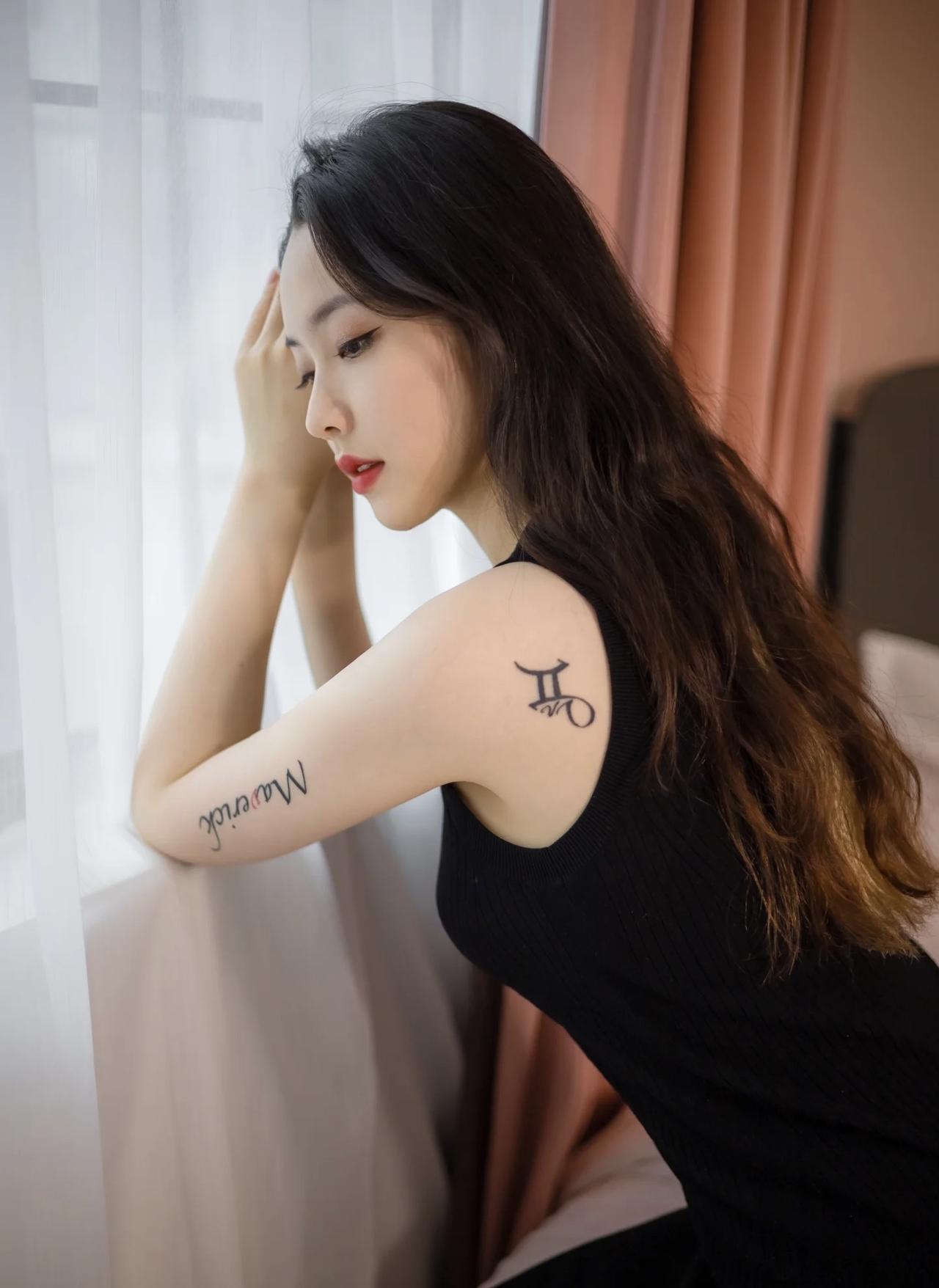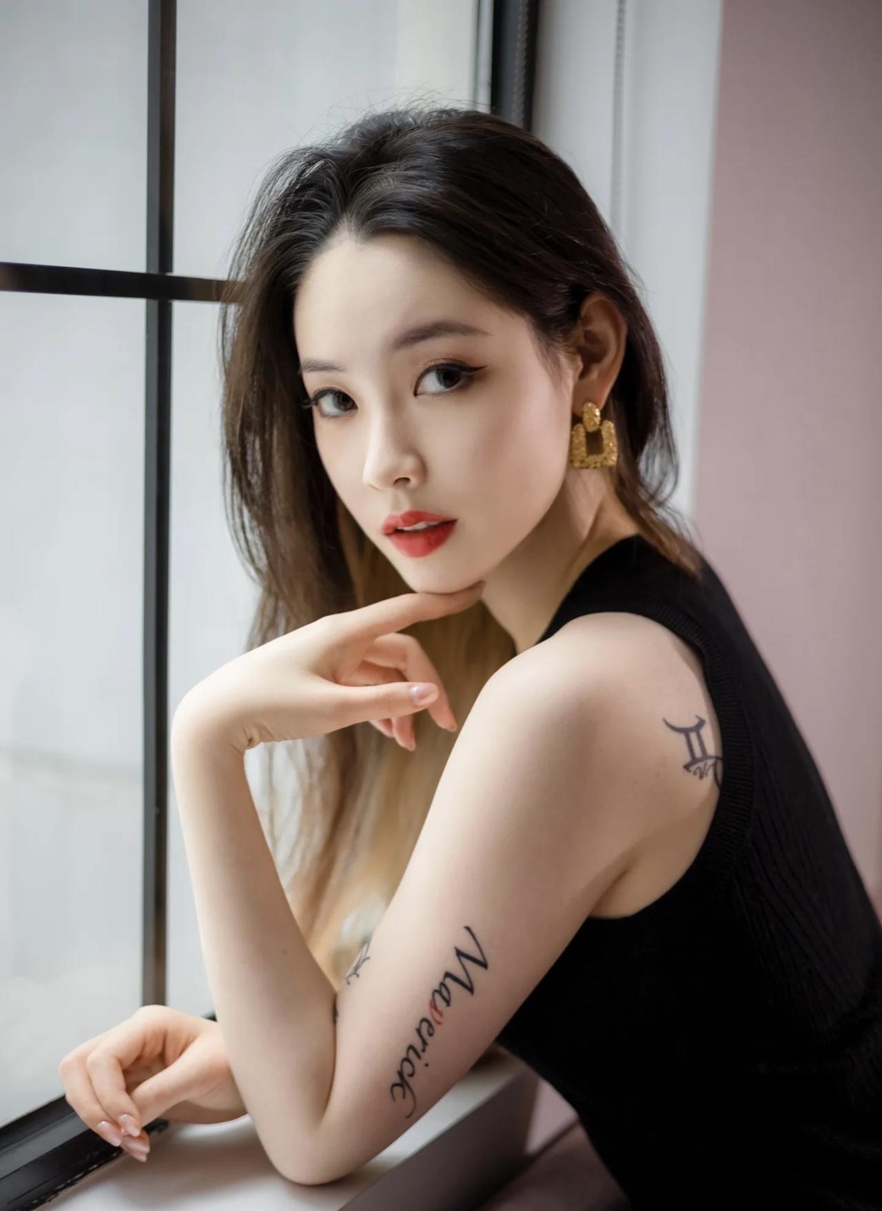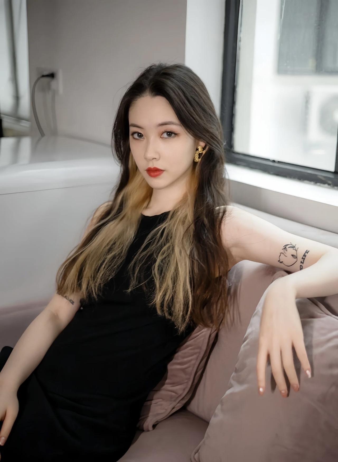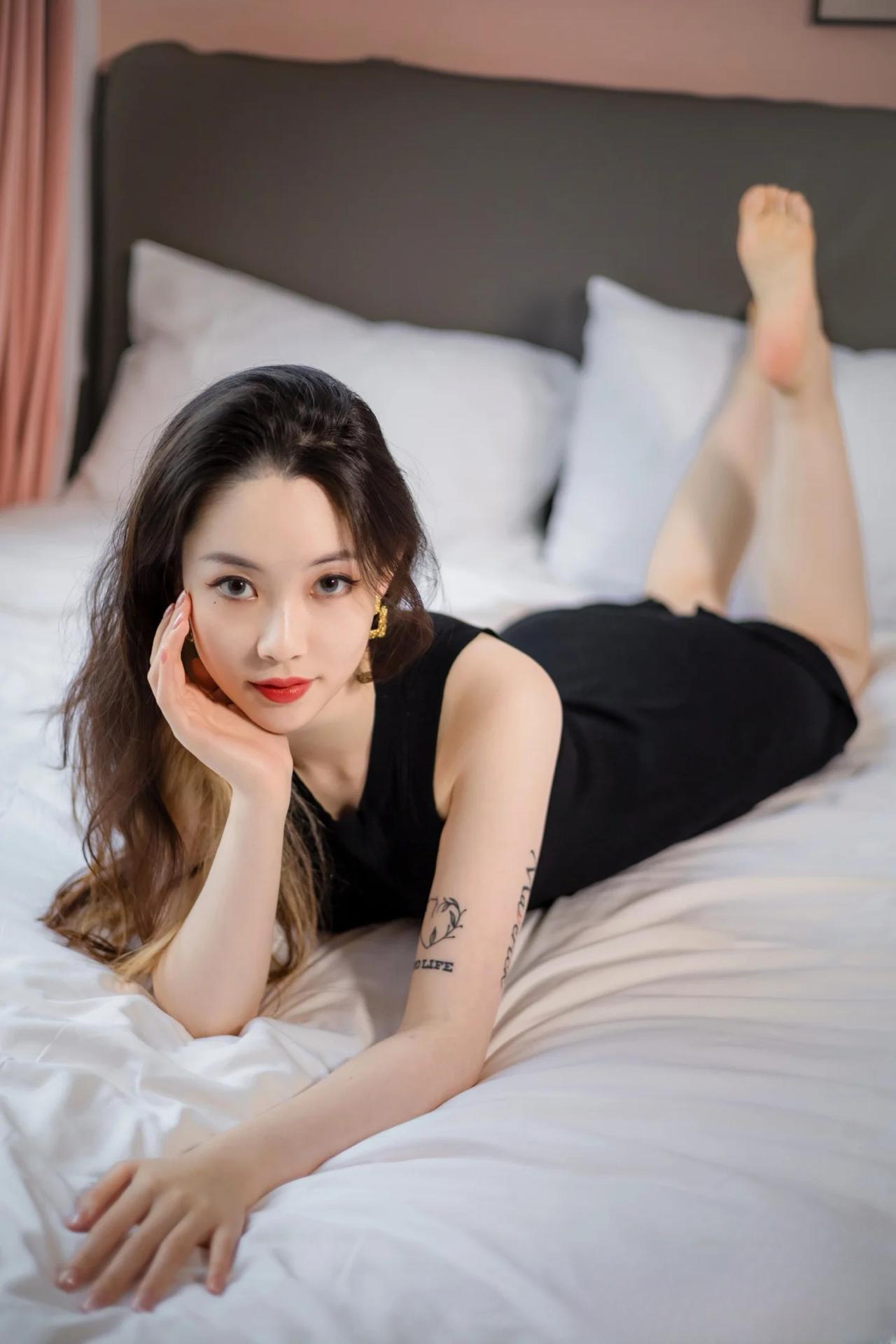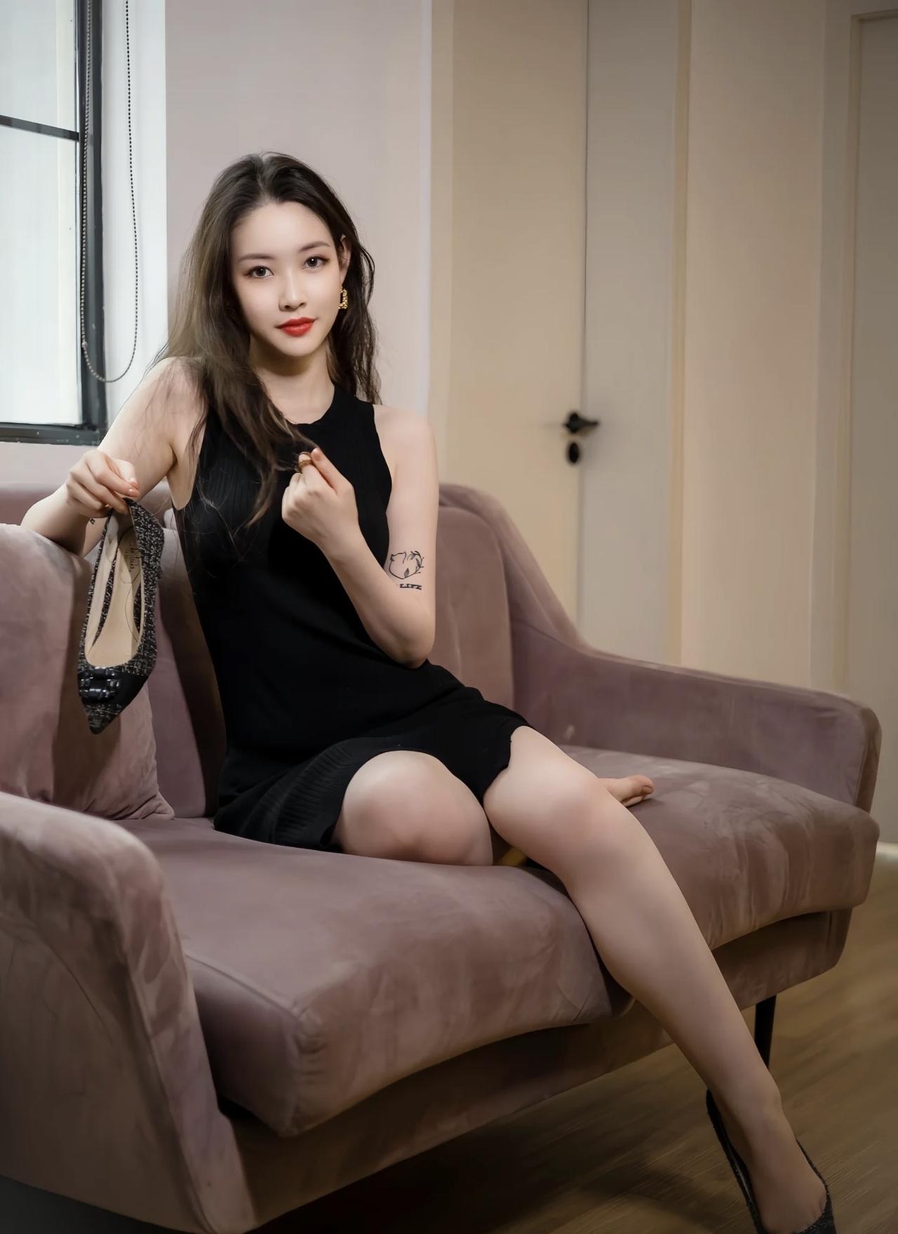 慵懒午后,黑裙红唇,优雅姿态,尽显魅力。