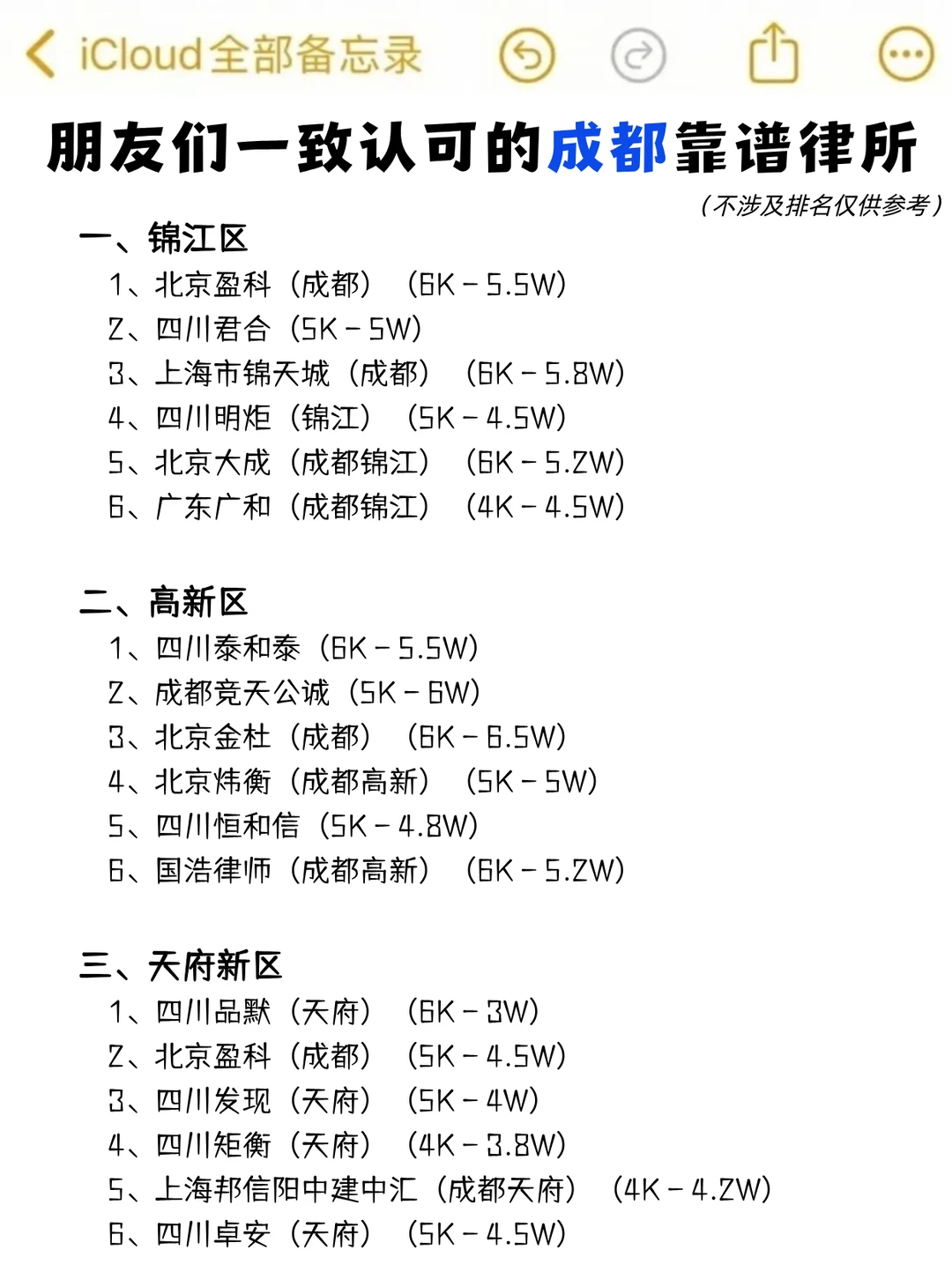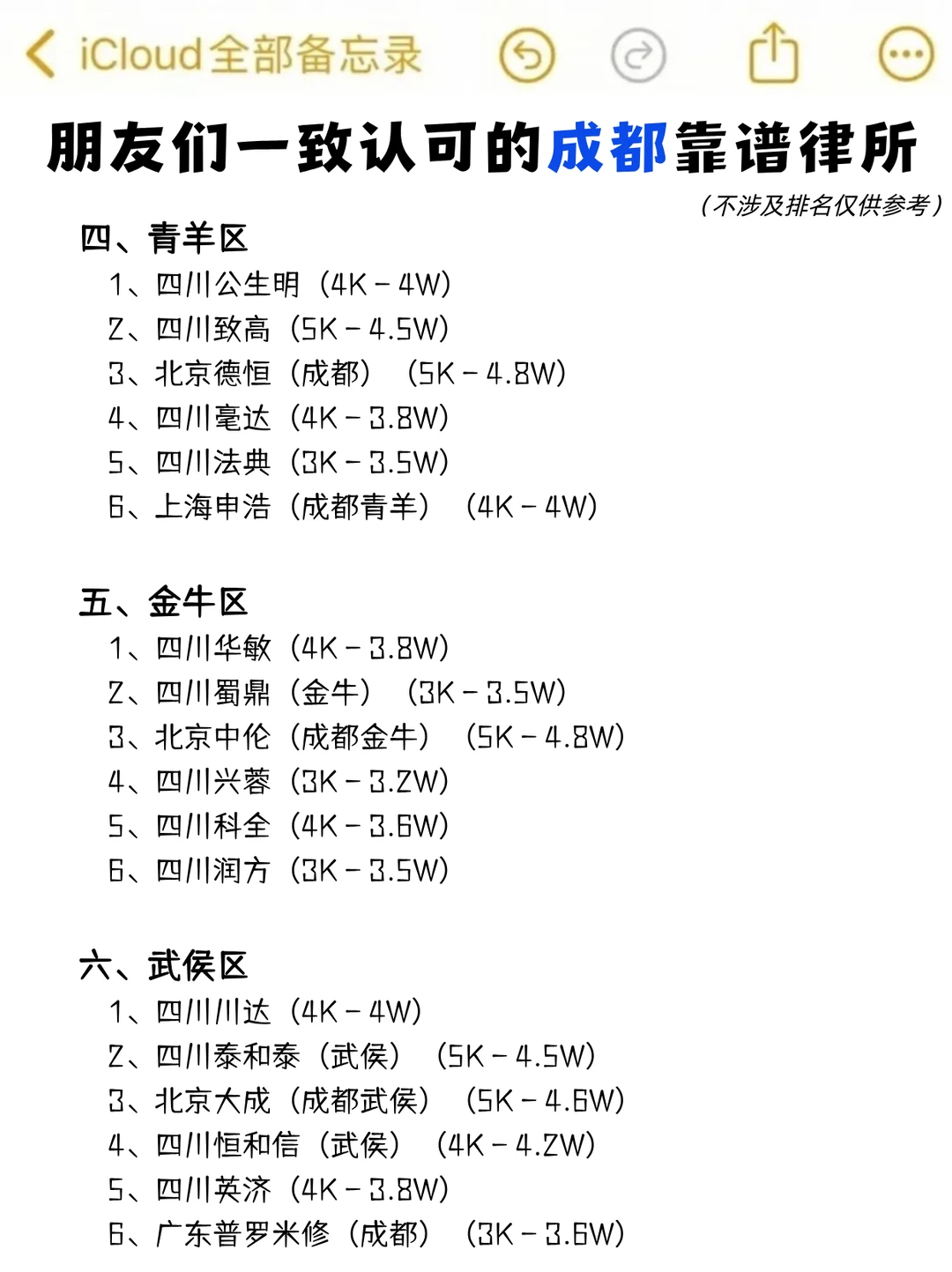 数据来源 数据来源于《四川省律师服务收费指导意见》、成都市律师协会 2025 年度律所备案信息、律师事务所官网收费公示及中国法律服务网成都律所登记数据整理。(排名不分先后,律所众多,篇幅有限,仅列举部分)