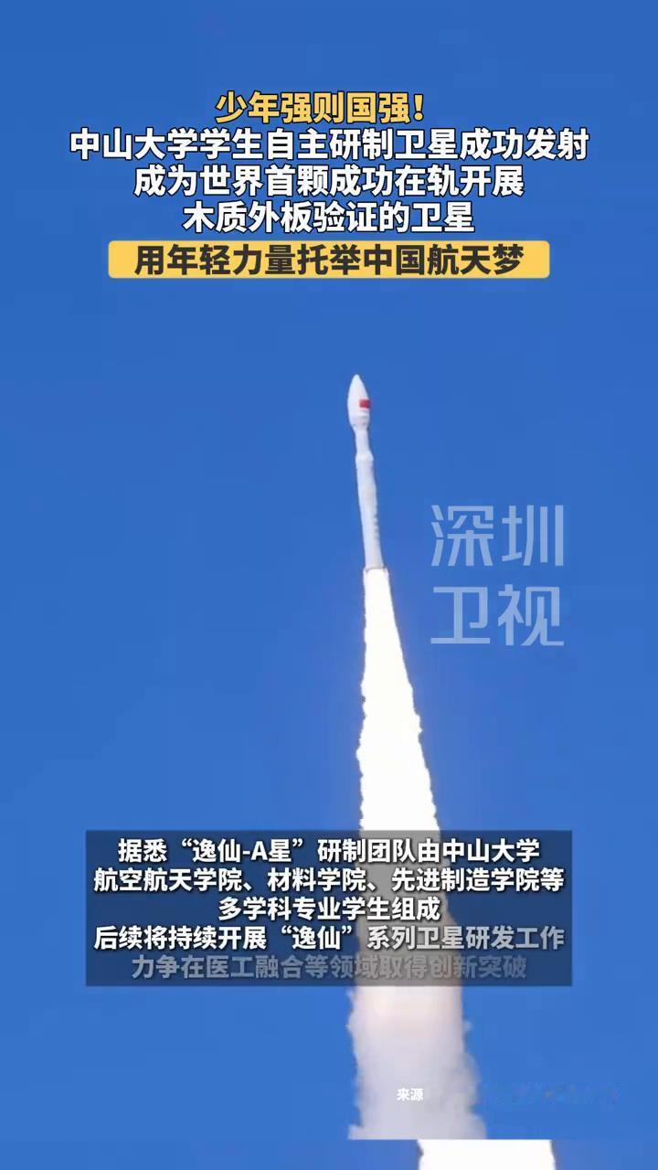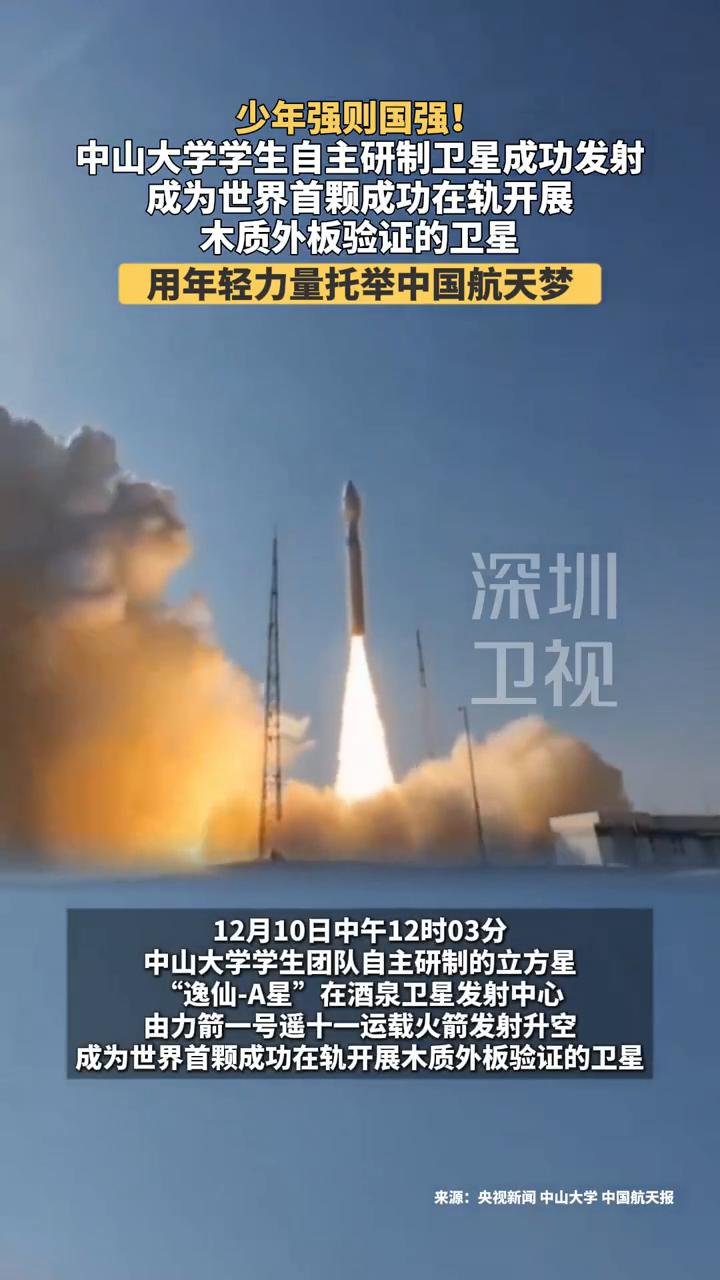 少年强则国强!中山大学学生自研卫星成功发射,成为世界首颗成功在轨开展木质外板验证的卫星,用年轻力量托举中国航天梦。 深圳卫视。 12月10日中午12时03分,中山大学学生团队自主研制的立方星"逸仙-A星"在酒泉卫星发射中心由力箭一号遥十一运载火箭发射升空,成为世界首颗成功在轨开展木质外板验证的卫星。 "逸仙-A星"计划在轨时间6个月,将开展卫星空间自拍成像与检测、木质外板在轨试验与应变测量、基于树莓派的软件定义卫星便捷式载荷开发技术验证等任务。 据悉"逸仙-A星"研制团队由中山大学航空航天学院、材料学院、先进制造学院等多学科专业学生组成,后续将持续开展"逸仙"系列卫星研发工作,力争在医工融合等领域取得创新突破。
