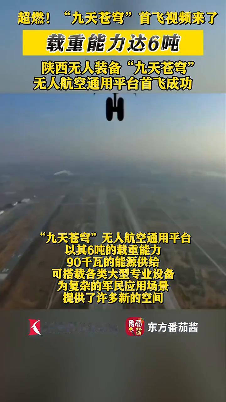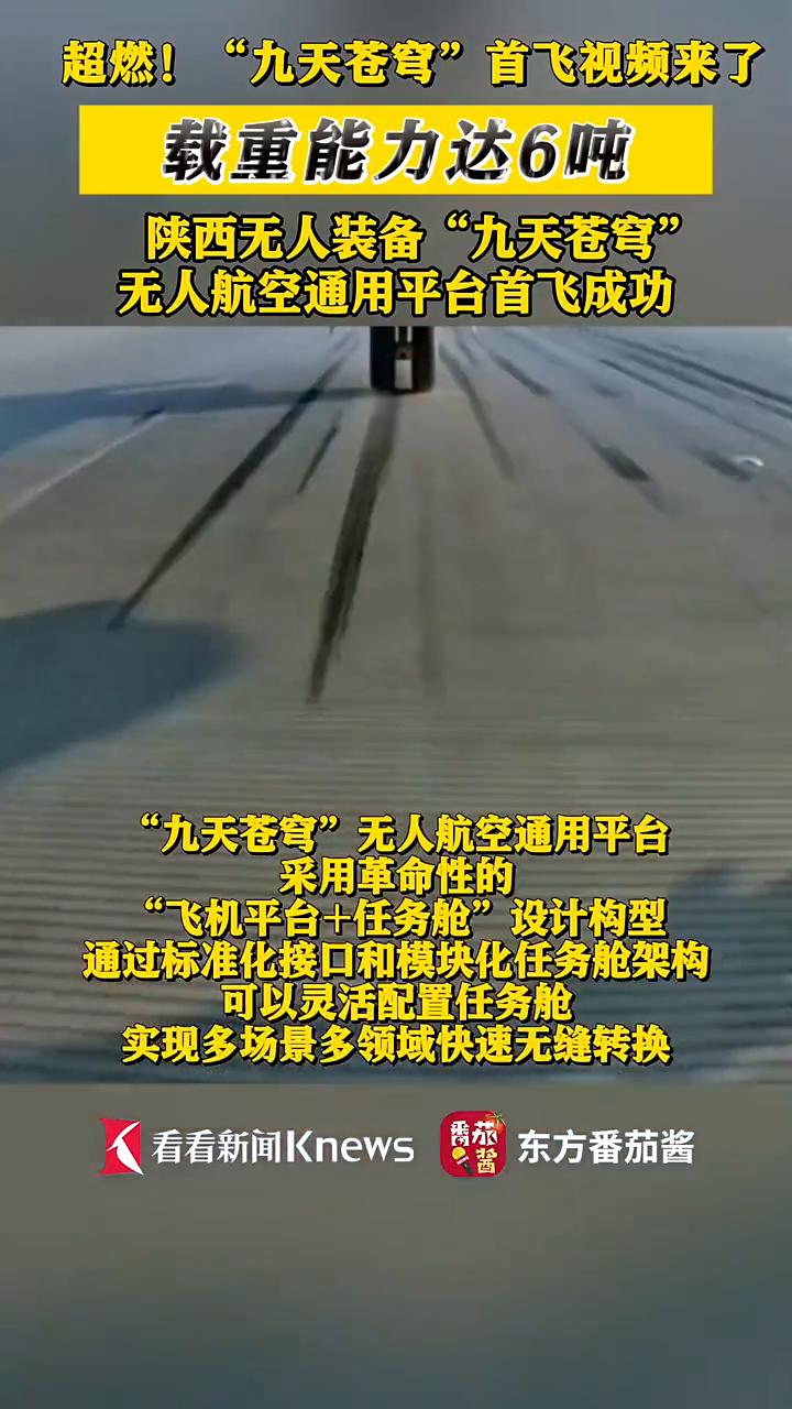 超燃!"九天苍穹"首飞视频来了,载重能力达6吨。 看看新闻Knews。 陕西无人装备"九天苍穹"无人航空通用平台首飞成功。2025年12月11日,作为全球载重能力最强的无人飞行平台,"九天苍穹"无人航空通用平台成功首飞。 采用革命性的"飞机平台+任务舱"设计构型,通过标准化接口和模块化任务舱架构,可以灵活配置任务舱,实现多场景、多领域快速无缝转换。以其6吨的载重能力,90千瓦的能源供给,可搭载各类大型专业设备,为复杂的军民应用场景提供了许多新的空间。