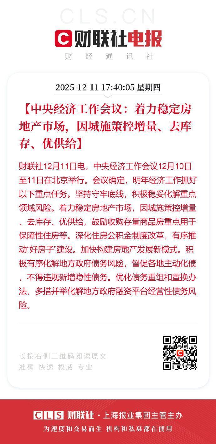 中央经济工作会议举行【中央经济工作会议:着力稳定房地产市场,因城施策控增量、去库存、优供给】财联社12月11日电,中央经济工作会议12月10日至11日在北京举行。会议确定,明年经济工作抓好以下重点任务。坚持守牢底线,积极稳妥化解重点领域风险。着力稳定房地产市场,因城施策控增量、去库存、优供给,鼓励收购存量商品房重点用于保障性住房等。深化住房公积金制度改革,有序推动“好房子”建设。加快构建房地产发展新模式。积极有序化解地方政府债务风险,督促各地主动化债,不得违规新增隐性债务。优化债务重组和置换办法,多措并举化解地方政府融资平台经营性债务风险。