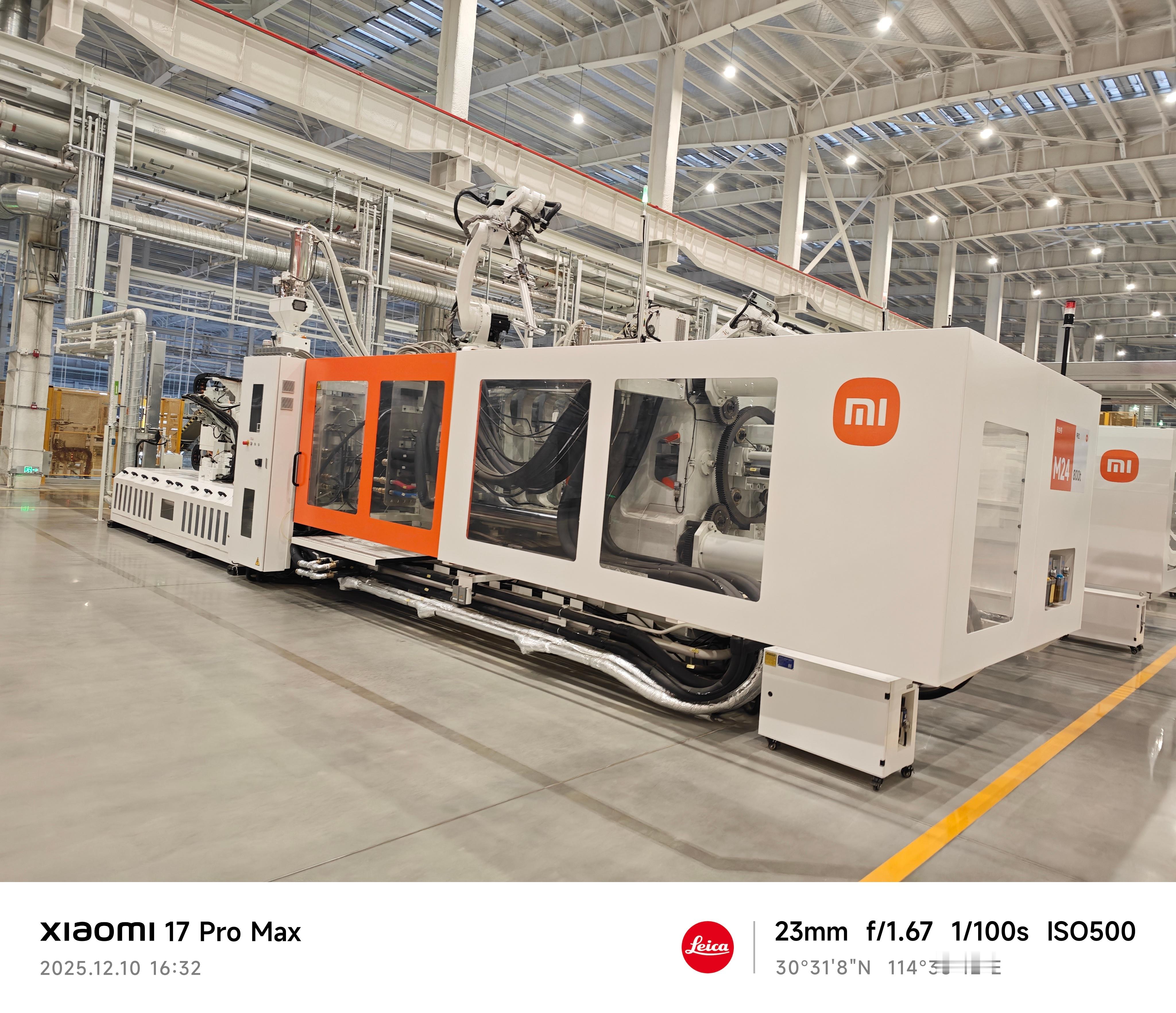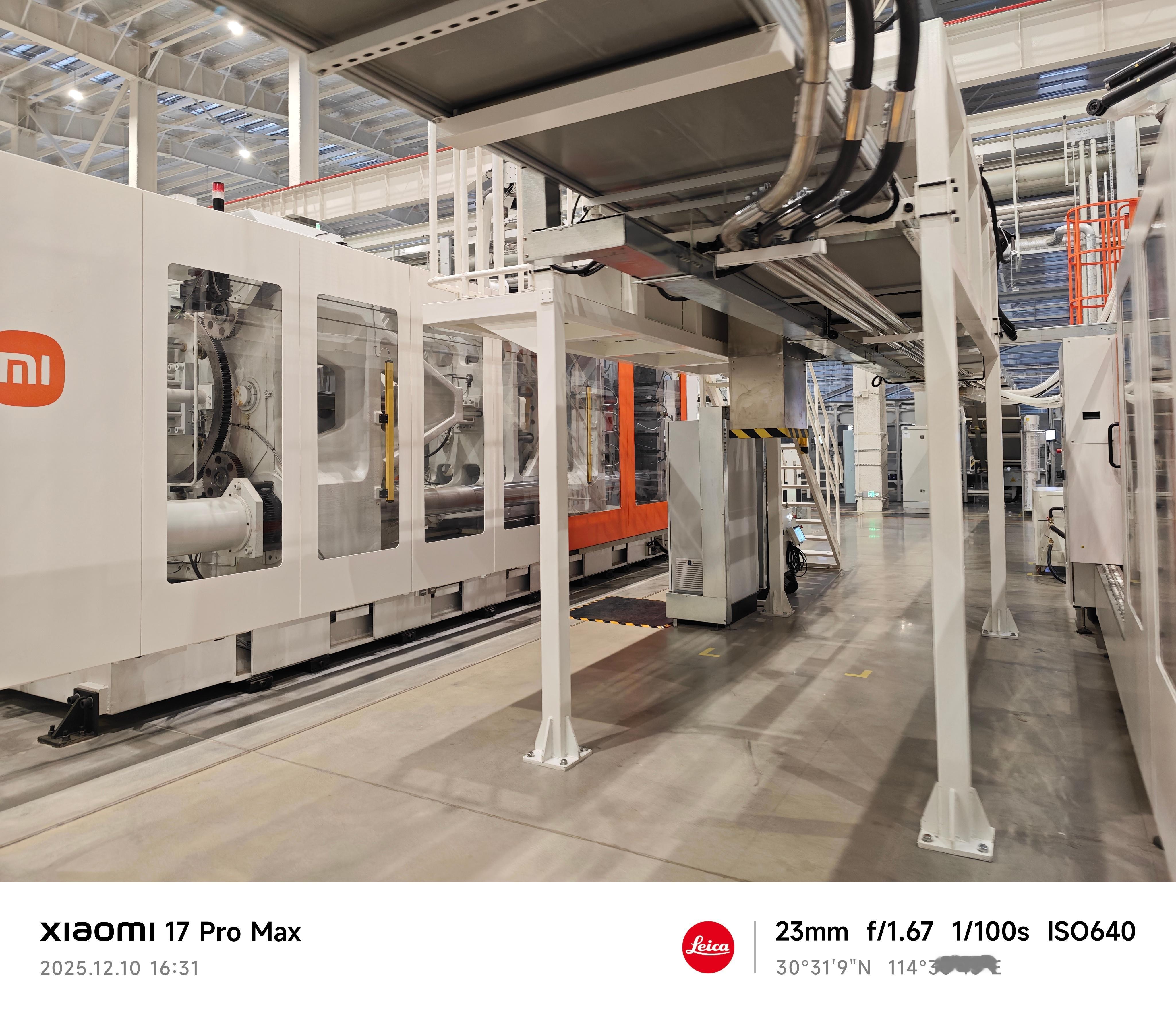 对了,小米武汉大家电智能工厂,里面几乎见不到人,很多都是由 AI 完成的,还包括了两个黑灯工厂。比如图中的注塑工厂,就实现了全流程的100%自动生产。图上的注塑机有20多台,二期还会继续投产。