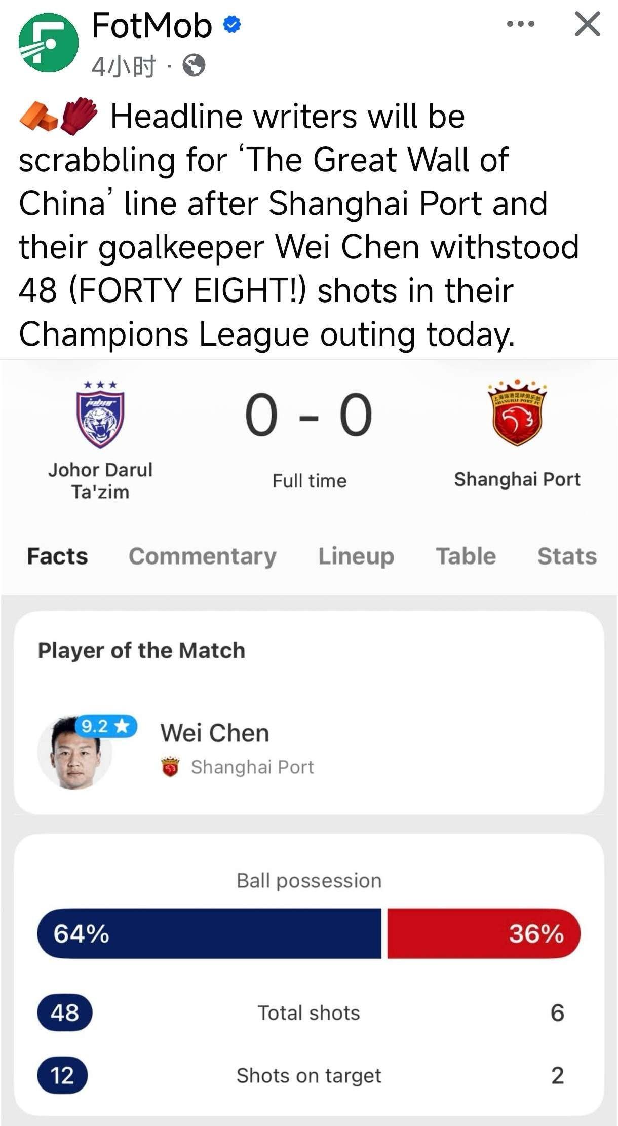 上海海港丢人丢到国外了!上海海港中超夺冠外媒不一定会关注,但是在亚冠精英联赛,中超联赛冠军上海海港被对方射门48次,外国媒体专门发文报道了,文章还重点突出了上海海港是中超联赛冠军。 不得不说,上海海港门将陈威一战成名,他已经火到国外了,不知道未来会不会有国外球队想要邀请陈威加盟球队。 今年亚冠精英联赛,还有成都蓉城帮忙撑撑场面,中超联赛不至于颜面扫地。明年可能就上海海港一家俱乐部参加亚冠精英联赛,估计他们还是要被按在地上反复摩擦。 那么问题来了,上海海港内战内行、外战外行,是不是可以把亚冠精英联赛名额让给成都蓉城或者山东泰山?#中国足球#