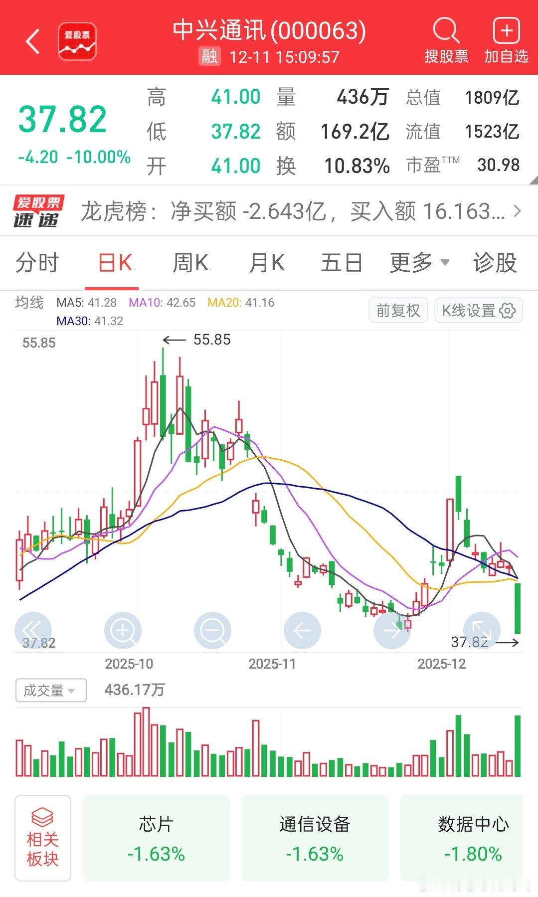 A股【中兴通讯龙虎榜:3机构合计净买入6.32亿元】中兴通讯今日跌停,龙虎榜数据显示,上榜营业部席位全天成交34.97亿元,占当日总成交金额比例为20.67%。其中,买入金额为16.16亿元,卖出金额为18.81亿元,合计净卖出2.64亿元。具体来看,机构买入10.34亿元,卖出4.02亿元,合计净买入6.32亿元。此外,国泰海通证券上海松江区中山东路证券营业部、深股通专用分别卖出5.22亿元、4.77亿元;深股通专用、长城证券杭州民心路证券营业部分别买入3.71亿元、1.02亿元。
