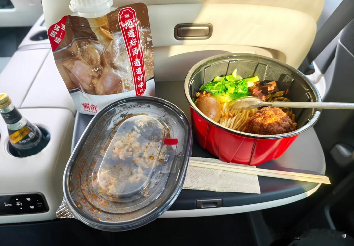 我说实话,虽然买了好几台MPV,但小桌板我一直没觉得真有用。 所以这玩意儿就还是到了这个场景中,才能有切实的感受。 两个约好的时间中间多一个小时,刚好吃个饭看个剧。