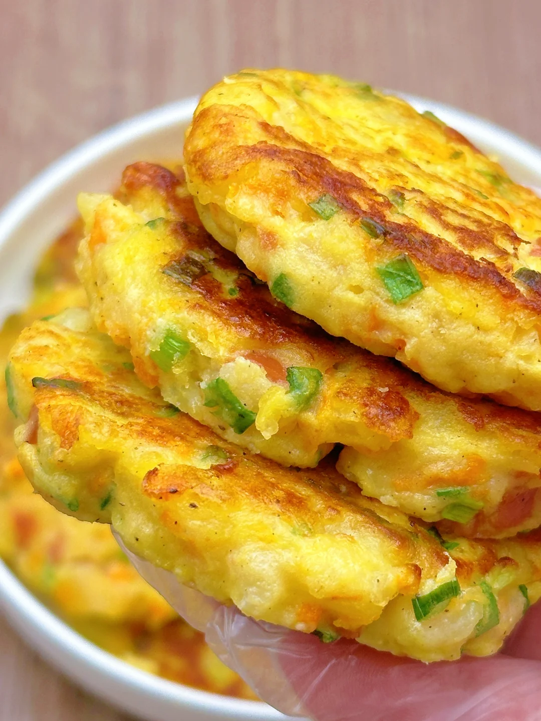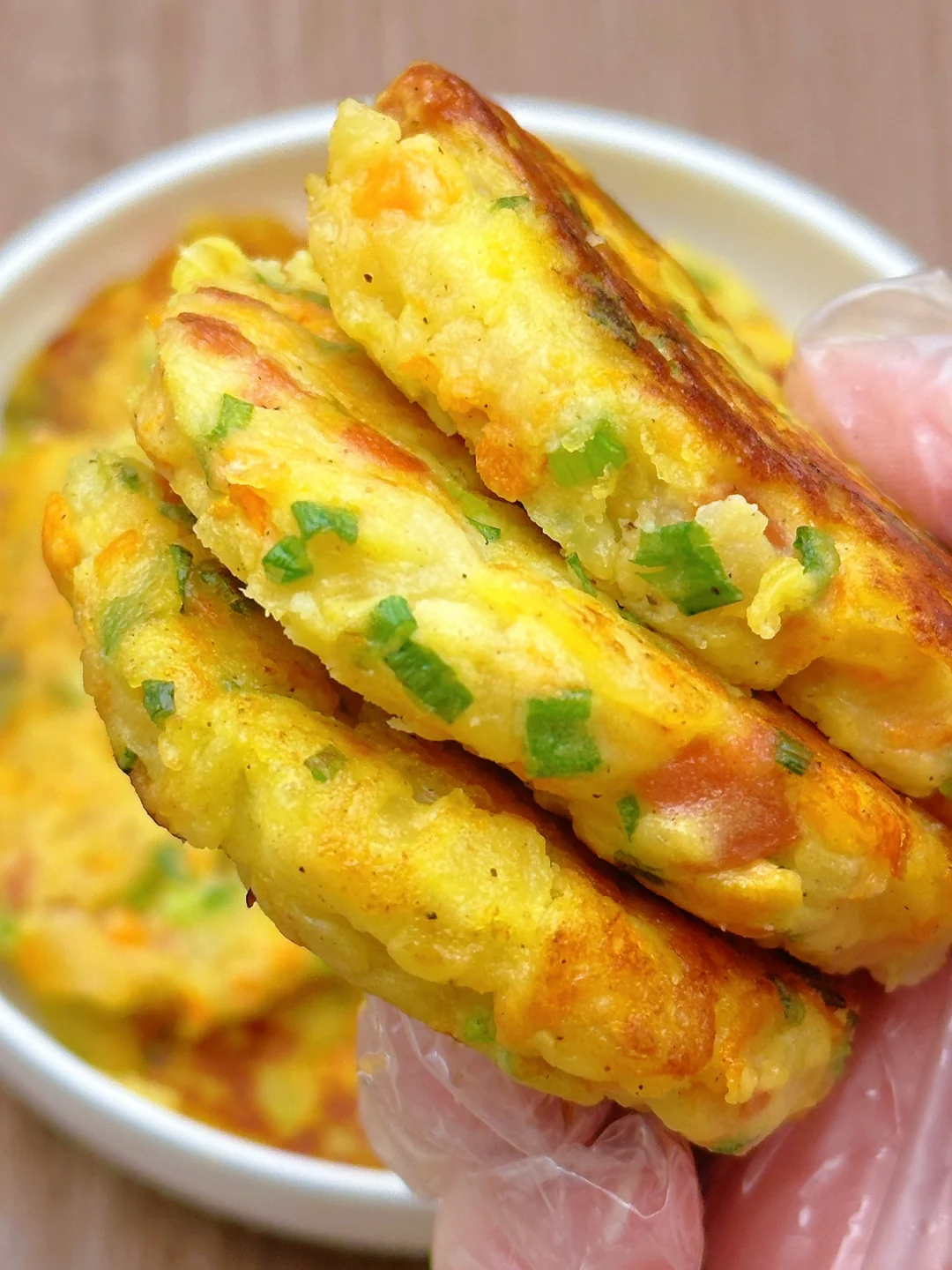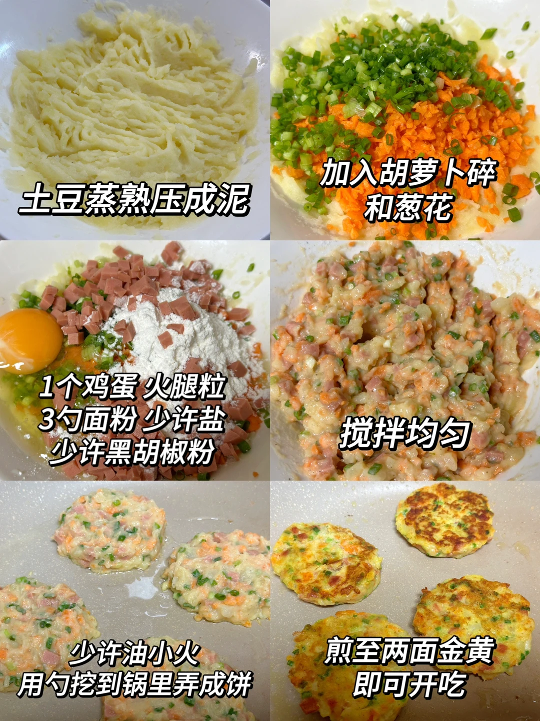 姐妹们香糯的土豆香肠饼真的是香迷糊啦!外脆里糯,软糯香甜,每一口下去都软软糯糯的,加了火腿丁味道嘎嘎的香,好吃到舔手指!我们全家人都很爱,一个饼才30多大卡,对减脂期的姐妹也很友好,而且做法简单,姐妹们快去试试吧~ 🥗食材:土豆、胡萝卜、面粉、火腿肠、葱花 🥘做法:如图所示~⚠小火小火小火