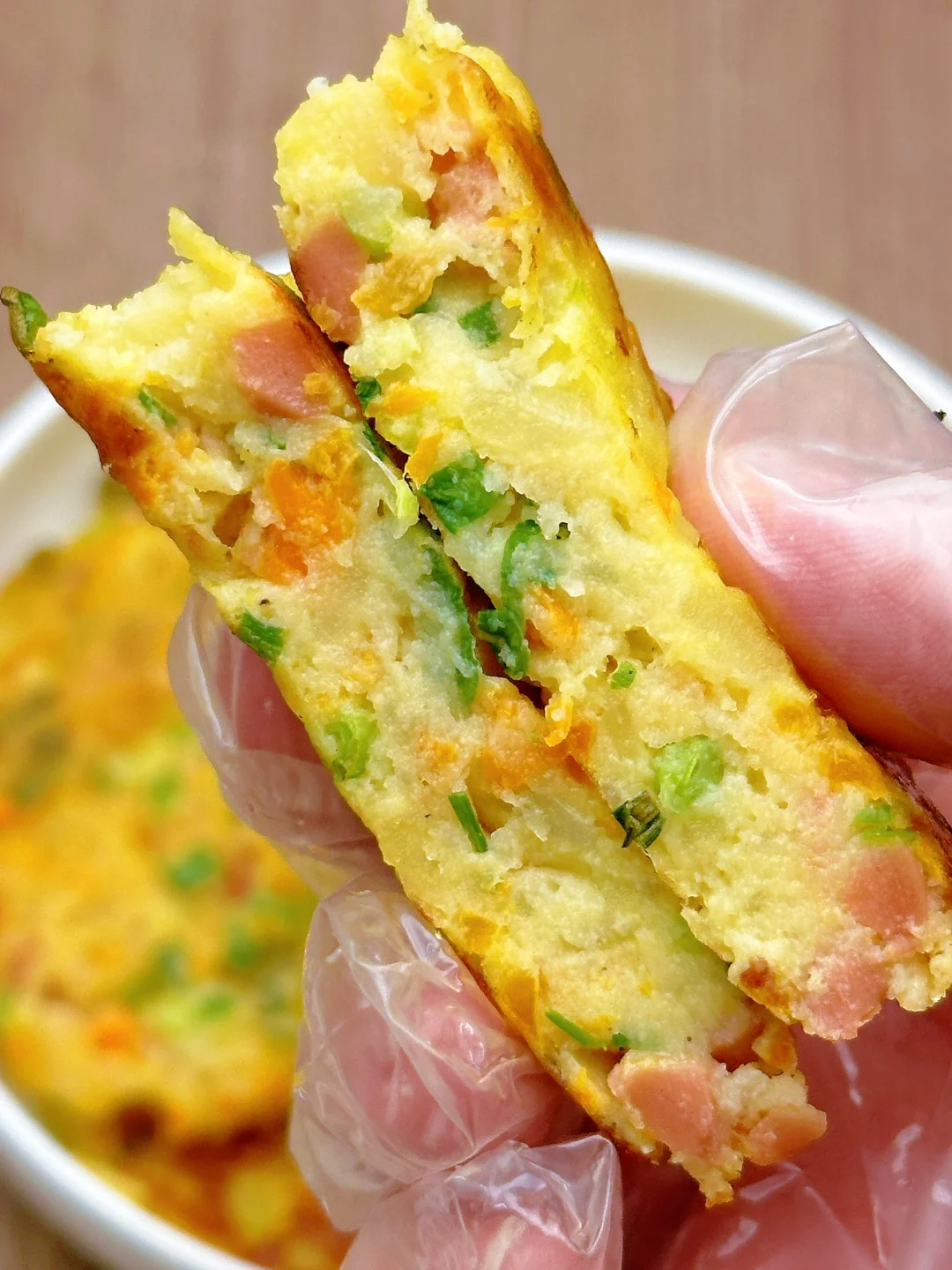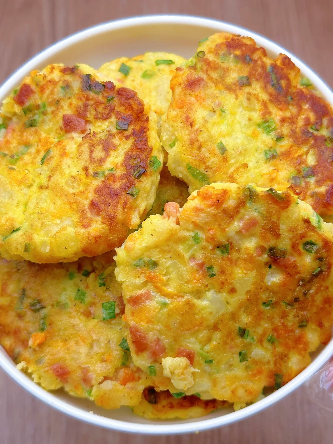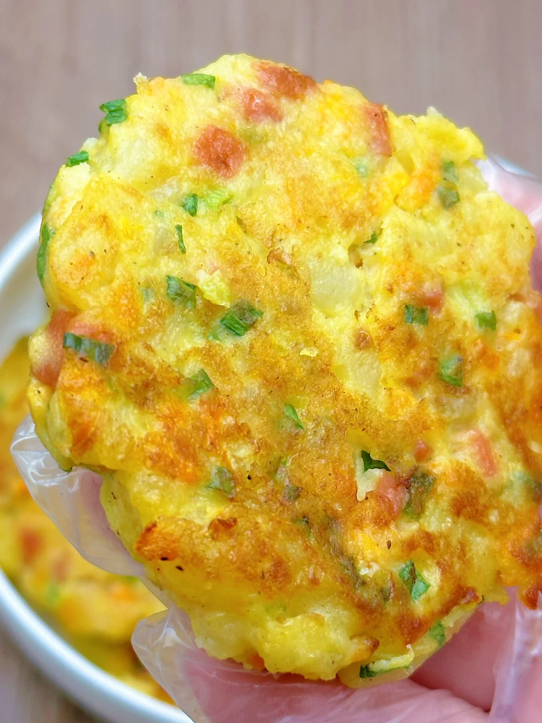 姐妹们香糯的土豆香肠饼真的是香迷糊啦!外脆里糯,软糯香甜,每一口下去都软软糯糯的,加了火腿丁味道嘎嘎的香,好吃到舔手指!我们全家人都很爱,一个饼才30多大卡,对减脂期的姐妹也很友好,而且做法简单,姐妹们快去试试吧~ 🥗食材:土豆、胡萝卜、面粉、火腿肠、葱花 🥘做法:如图所示~⚠小火小火小火