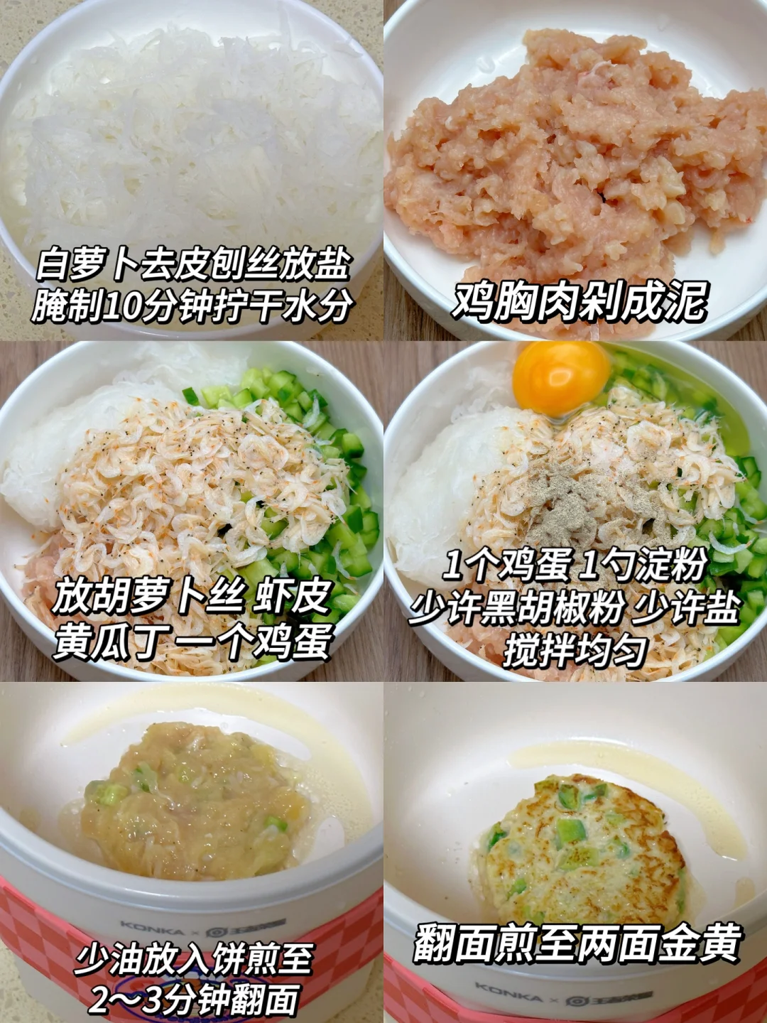 又到了吃白萝卜的季节啦~今天给姐妹们分享一个巨好吃的鸡胸肉萝卜饼,清甜软糯,做法简单,鸡胸肉一点都不柴,一大盘也才200多大卡,减脂期的姐妹们赶紧安排啦~ 🥗食材:鸡胸肉、虾皮、白萝卜、黄瓜、鸡蛋 🥘做法:如图所示~ 1⃣️白萝卜去皮刨丝,放盐腌制10分钟捏干水分 2⃣️鸡胸肉剁成泥,放入白萝卜丝➕虾皮➕黄瓜丁➕1个鸡蛋➕1勺淀粉➕少许黑胡椒粉➕少许盐搅拌均匀 3⃣️锅里少油放入饼,煎制两面金黄即可开吃(第一面煎2~3分钟再翻面哟,不然容易不成型)