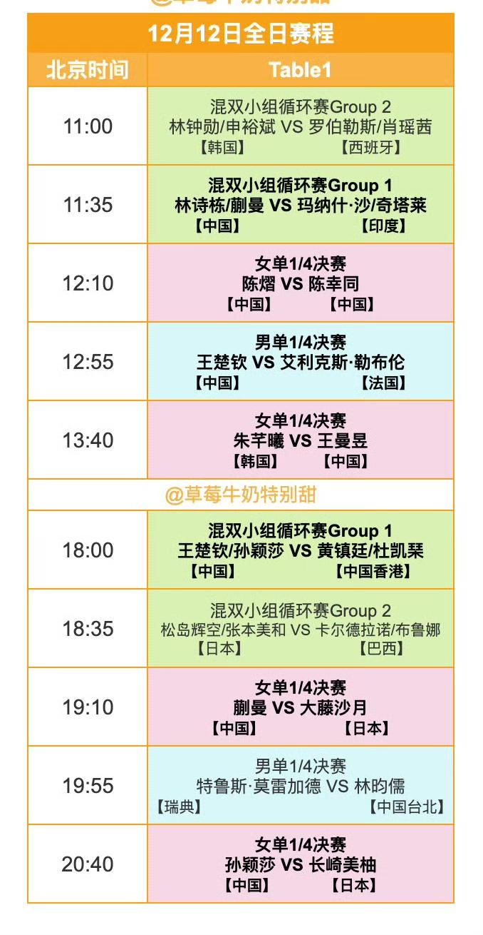 香港总决赛明日(12月12日,周五)赛程! 2025WTT香港总决赛12月12日赛程如图所示。 明天进行单打的1/4决赛,后天也有半天时间进行单打比赛,混双项目进行小组循环赛第三轮。 明天国乒选手有七场比赛,其中有一场内战,就是明天中午十二点多的陈熠🇨🇳VS陈幸同🇨🇳。 明天中午,王楚钦🇨🇳要对阵大勒布伦🇫🇷,明天晚上八点多,莎莎对阵长崎美柚。 小伙伴们一起观赛哦[奋斗]! (感谢草莓老师的图片)