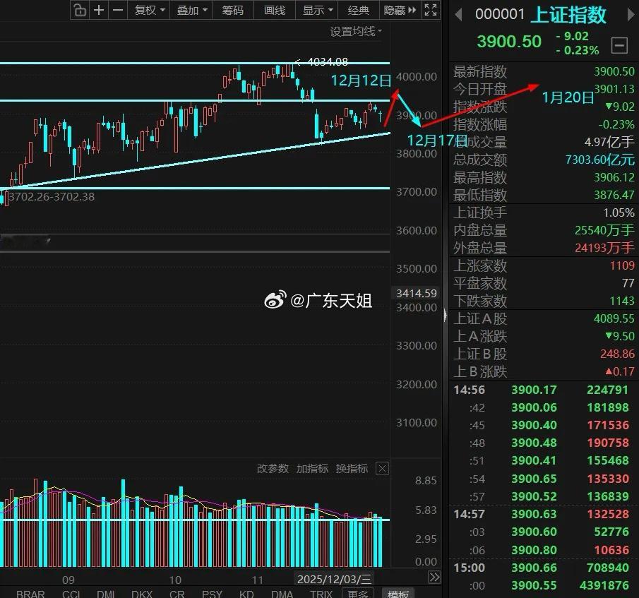 兄弟们莫慌,大阳线就在明天!今天的下跌有两种原因:一是对昨天下跌的再次确认,这意味着后面的上涨会更彻底;二是今天凌晨美联储宣布再次降息25个基点,主力借利好砸盘,让散户彻底绝望;当下大盘在进行底部震荡盘整,最近8天只有两天普涨,其余六天全部都是4000家下跌;今天利好情况下,主力再次作妖企图让散户彻底绝望割肉出局,但今天大盘并没有明显放量;说明主力已经割不动了,散户已经彻底躺平,明天就要大涨,这是别人不敢说的我来说;我们昨天就讲过,只要大盘不跌破3830点,行情就在我们掌握之中,跌下来都是机会;今天的下跌让我喜出望外,明天的中大阳线就要来了,不管你信不信,明天将收出大阳线;但短线3940附近的压力依然较重,后续仍然不会被直接突破,大的节奏不变,逢高勿追;