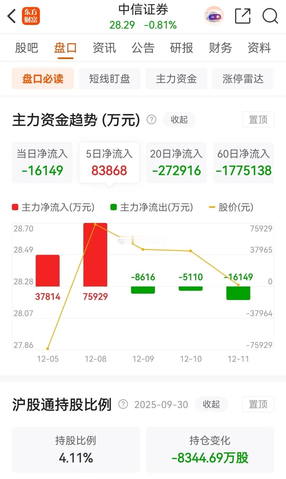 东方财富和中信证券高开低走,双双下跌,只是在尾盘时,中信证券是小幅勾起,而东财则是以最低价报收,在资金流向上,今天二者都是被主力资金净卖出。东方财富今天早盘高开后就直接进入了阴跌模式,一直跌到收盘,下跌的跌幅为1.93%,收盘报价为22.84元,全天的成交金额为 44.71 亿元,属于缩量调整。在资金流向上,今天被主力资金大幅净卖出了6.1492亿元,目前已是连续四天被主力资金净卖出了,近五个交易日得合计净卖出金额为9.5122亿。从走势上看,今天收出的这根阴线,直接击穿了五、十和二十日均线,再次回到了之前的破位态势之中。中信证券今天同样也是高开低走,开盘后直接进入下跌模式,直到了尾盘时才有所勾起。今天的跌幅为 0.81%,收盘报价为28.29元,成交金额约为21.03亿元,属于缩量调整,且是连续三天缩量了。在资金流向上,主力资金今天净卖出了1.6149亿元,目前已是连续三天被主力资金净卖出,而近五个交易日则是合计被净买入了8.3868亿元。从走势上看,中信证券今天的低点和昨日几乎一样,依然没有完全封闭本周一的跳空上涨缺口,整体走势还是要比东财强势不少。对于二者的后续走势,从投资逻辑上来看,中信证券的股息率为2.6%(分红率32%),吸引稳健资金;而东方财富的股息率仅为0.7%,利润留被存用于技术投入。此外,当前券商板块的PB 1.52倍(历史40%分位),但ROE预期达70%分位,存在估值修复空间。