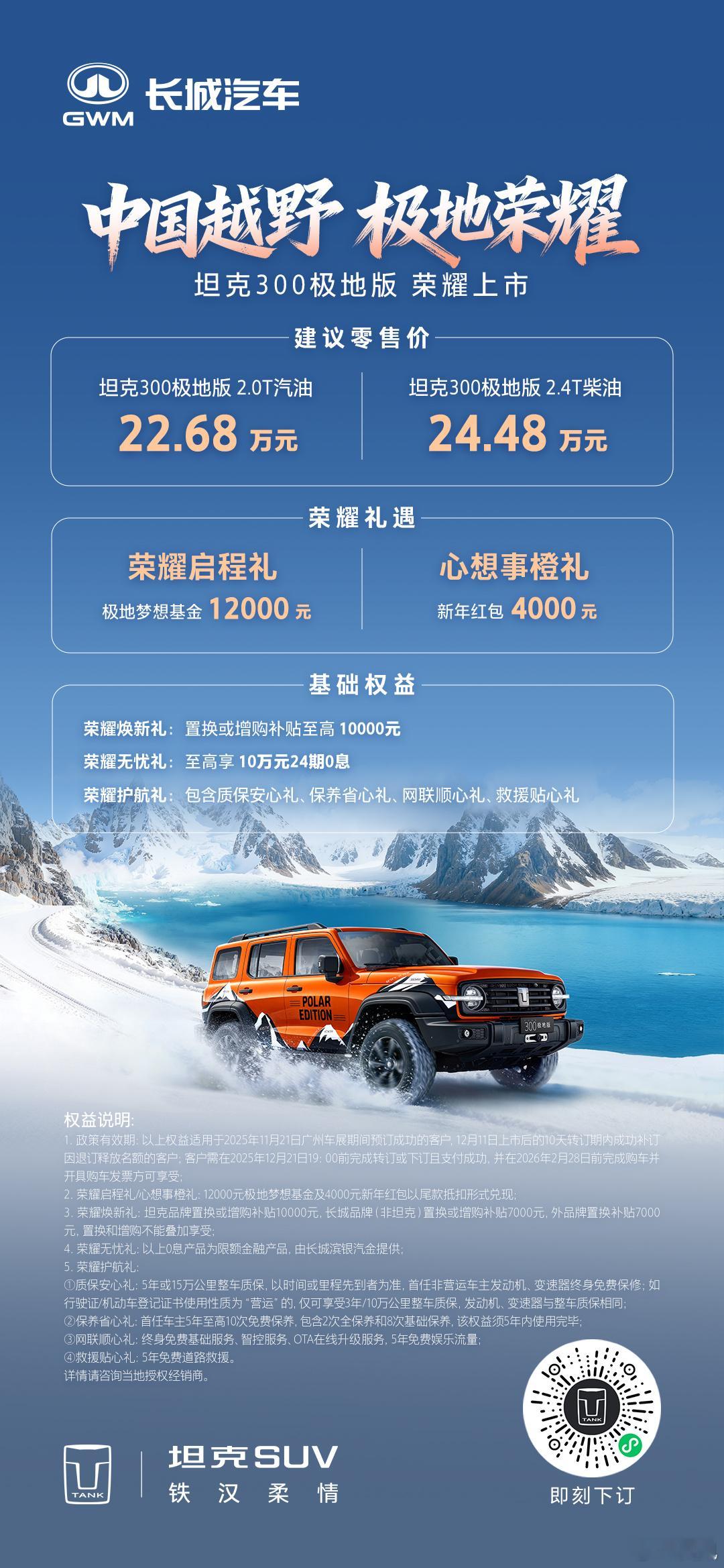 国产成功的硬派SUV,坦克300肯定占有一席,它一定程度平替普拉多成为国人喜欢的越野座驾,目前坦克300全球累计销量突破50万台为纪念这个成绩,今天推出坦克300极地版,汽油版22.68万/柴油版24.48万,带有专属的“极地橙”车漆,“极地荣耀徽章”以及“极地锋芒”拉花,原厂17英寸AT全地形轮胎,9500磅无线遥控绞盘等,限量300辆 ,不过发微博这会儿可能已经抢光了新越野新向往买一台车交一群朋友