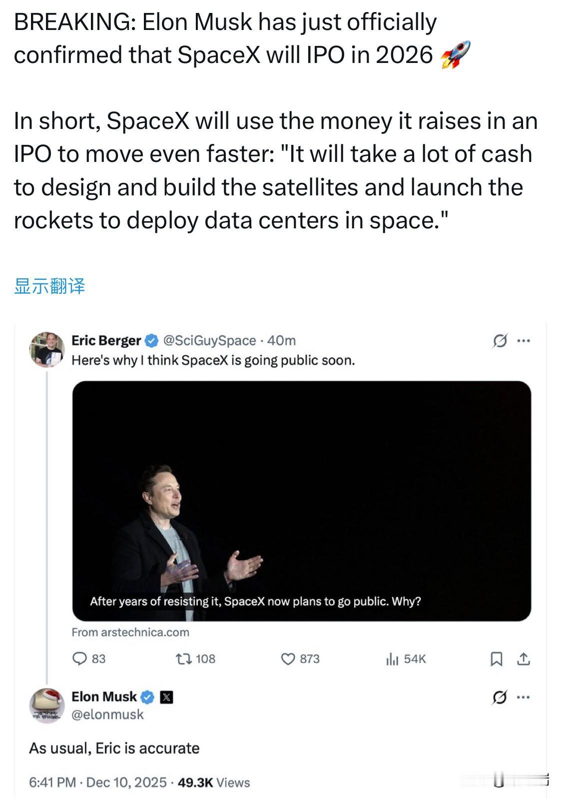 突发新闻:埃隆·马斯克刚刚正式确认,SpaceX将于2026年上市。 简而言之,SpaceX 将利用 IPO 筹集的资金加快发展速度:“设计和建造卫星以及发射火箭在太空部署数据中心需要大量资金。”