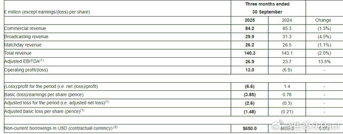 曼联公布第一季度财报。总收入1.403亿英镑,较去年同期的1.431亿英镑略有下降。季度营业利润为1300万英镑,而去年同期为亏损700万英镑。首席执行官贝拉达表示:"这些强劲的财务数据反映了曼联的韧性,我们在俱乐部转型方面取得了重大进展。过去一年中所做的艰难决策,带来了成本基础的持续降低,并形成了一个更精简、高效的组织架构,为长期推动俱乐部竞技和商业表现的提升做好了准备。"
