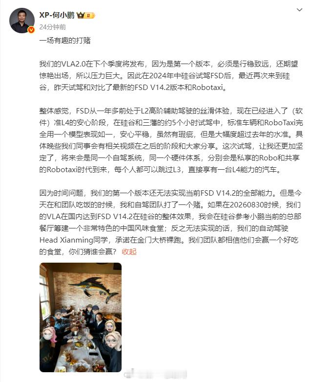 何小鹏去了硅谷,试驾了最新版本的FSD V14.2,还发文“打赌”了:如果在 2026 年 8 月 30 日,小鹏的 VLA 在国内达到 FSD V14.2 在硅谷的整体效果,自己将会在硅谷参考小鹏当前的总部餐厅筹建一个非常特色的中国风味食堂;反之无法实现的话,小鹏的自动驾驶 Head Xianming 同学,承诺在金门大桥裸跑。但也真诚的表示小鹏(VLA)的第一个版本还无法实现当前 FSD V14.2 的全部能力同时,也获得特斯拉官方的回应:特斯拉的FSD(全自动驾驶)系统近日获得了来自其最强劲的中国竞争对手——小鹏汽车CEO贺小鹏的盛赞。贺小鹏在亲自体验后,对特斯拉的FSD 14.2和Robotaxi(自动驾驶出租车)系统给予了高度评价,称其彻底改变了驾驶体验,从流畅的L2级提升到了接近L4级的水平我觉得何小鹏这个赌约应该很有信心了,不能真的裸跑吧。。。。那指定是会赢小鹏汽车特斯拉
