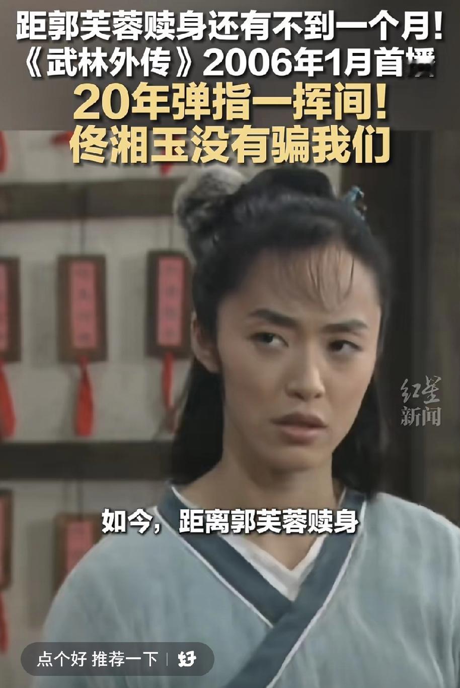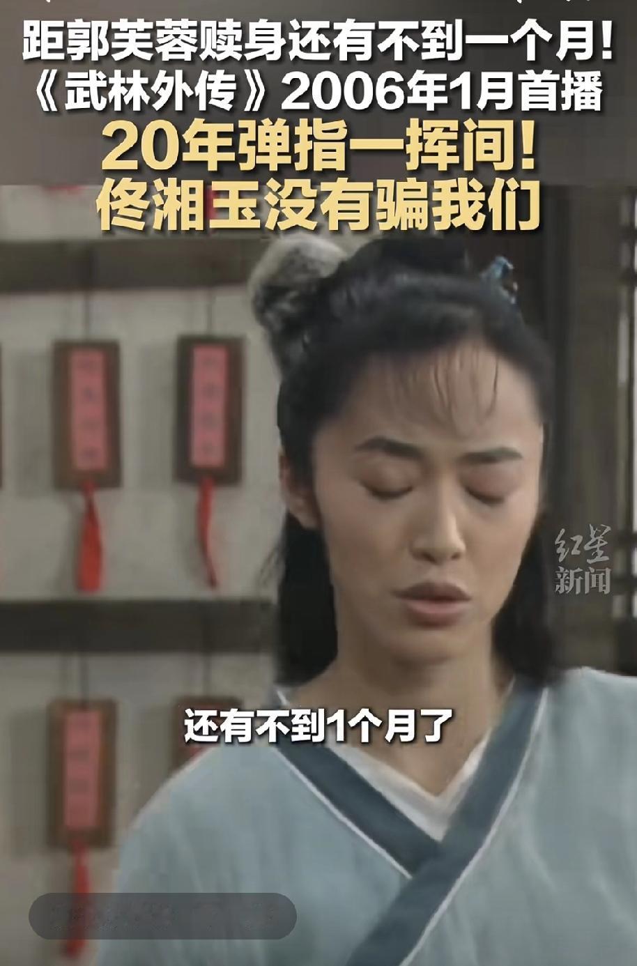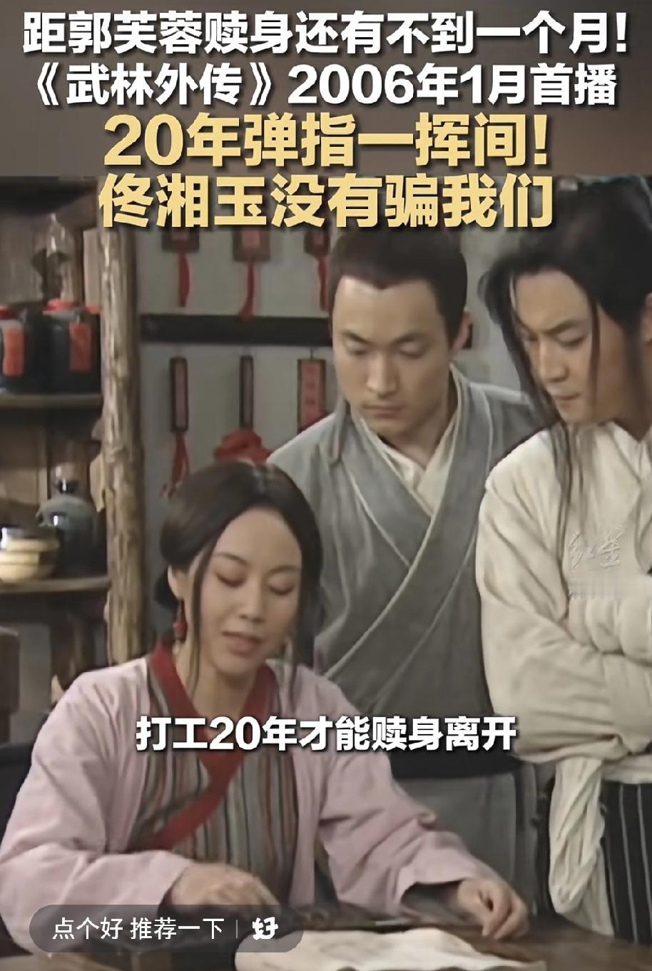 还记得武林外传佟湘玉让郭芙蓉打工20年还债赎身吗?当时佟掌柜说:20年快的很,就是弹指一挥间。没想到,现在距离那个20年就差一个月不到了。 2006年1月武林外传开播,没想到吧20年了。那时候一起追武林外传的你好吗?我们都已经不再是少年。