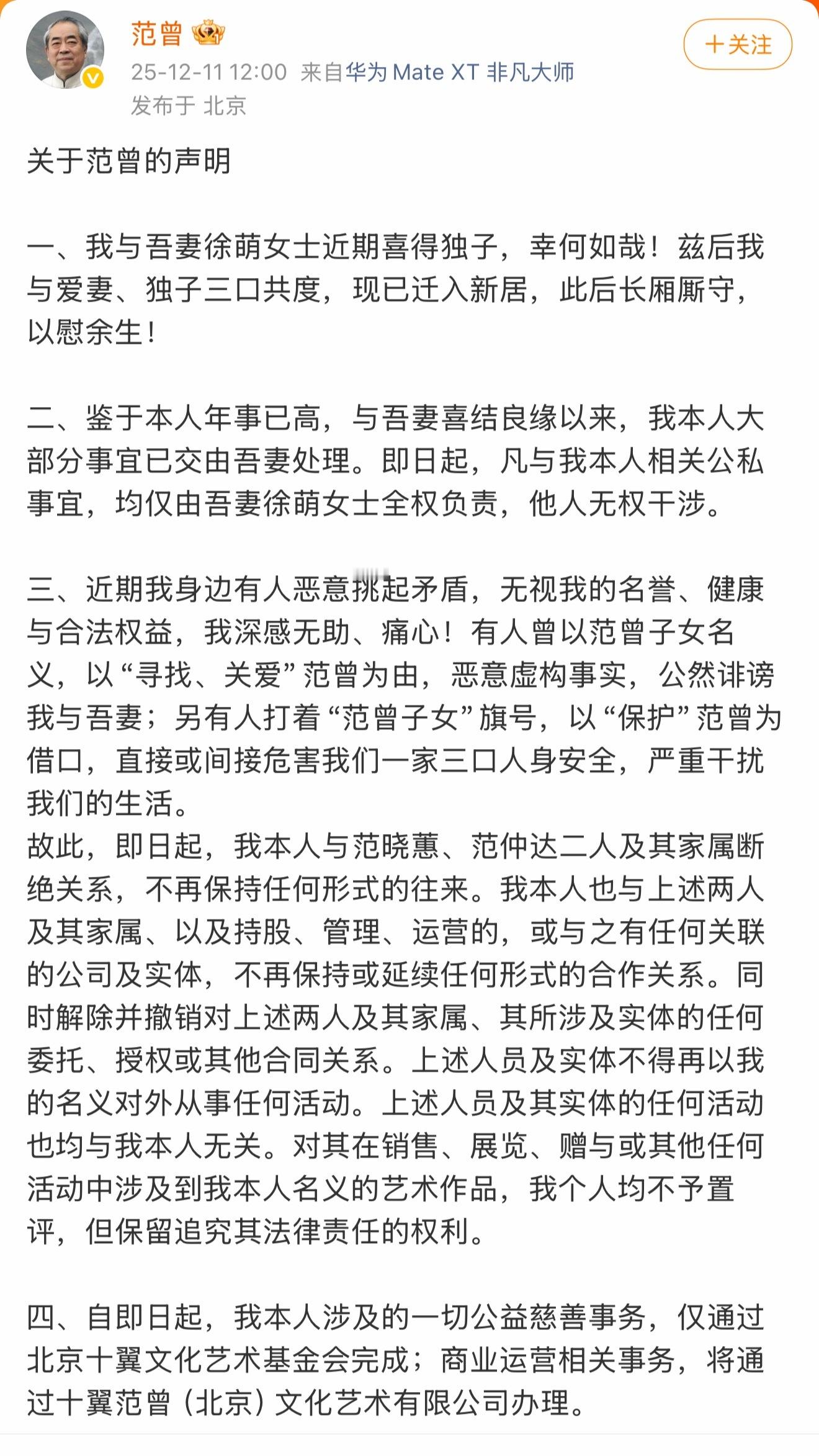 今天看到范曾宣布与女儿继子断绝关系 ,可称是最近沉闷热搜中的一股清流。他的人生,被一个“情”字贯穿。高龄艺术家开挂的一生与不得不说的情史;迎娶小娇妻后与子女反目成仇;鼓弄数十亿家产的争夺……随便摘出来一段,都很精彩。范曾面相有个挺有意思的点:白发黑眉。有这种特征的人,精血旺于骨血,主情感充沛,颇有天资,但晚年有“破血之厄”,易为血液方面的病症突然猝死。他如今提早安排身后事,对错暂且不论,终归是个有准备的安排。范曾成名伴随着极大争议,只要提他,人皆议论其人品。但他是唾沫淹不死的大人物,他对外界议论也毫不在乎,纷扰声反而成了他扬名的资本。都说重情的人也重义,但其实最重情的人最薄情。
