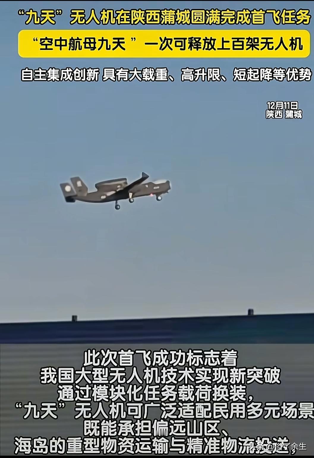 我国自主研发的"九天"无人机近日首飞成功,这款被称为"空中无人机航母"的大型装备可搭载200-300架微型无人机或巡飞弹,标志着我国无人机技术实现重大突破。 "九天"无人机具有大载重、高升限、短起降等优势,通过模块化任务载荷换装,可广泛适配民用多元场景。此次首飞成功不仅展示了我国在无人机领域的技术实力,也为未来在物流运输、灾害救援等领域的应用开辟了新途径。在全球无人机技术竞争日益激烈的背景下,这一成果将进一步提升我国的科技竞争力。