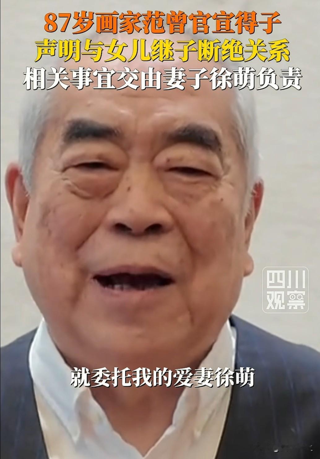 87岁著名书画家范曾近日宣布与第四任妻子"喜得独子",并表示与女儿、继子"断绝关系"。这一消息引发社会广泛关注和热议。 公众人物的私人生活虽然属于个人领域,但如此戏剧性的家庭变故难免引发讨论。从法律角度讲,断绝关系的声明在法律上并无效力,子女对父母的赡养义务和继承权依然存在。这一事件也折射出传统家庭观念与现代社会价值观的碰撞,值得我们深思。
