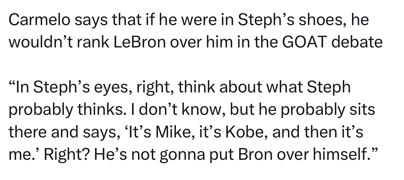 安东尼表示,站在库里的角度,库里不会在历史最佳的排名中把詹姆斯排在自己前面:“从斯蒂芬的角度来看,想想他会怎么认为。虽然我不确定,但他可能会这样认为:‘乔丹第一,科比第二,接着就是我自己。’对吧?他肯定不会把勒布朗排在他自己前面。”