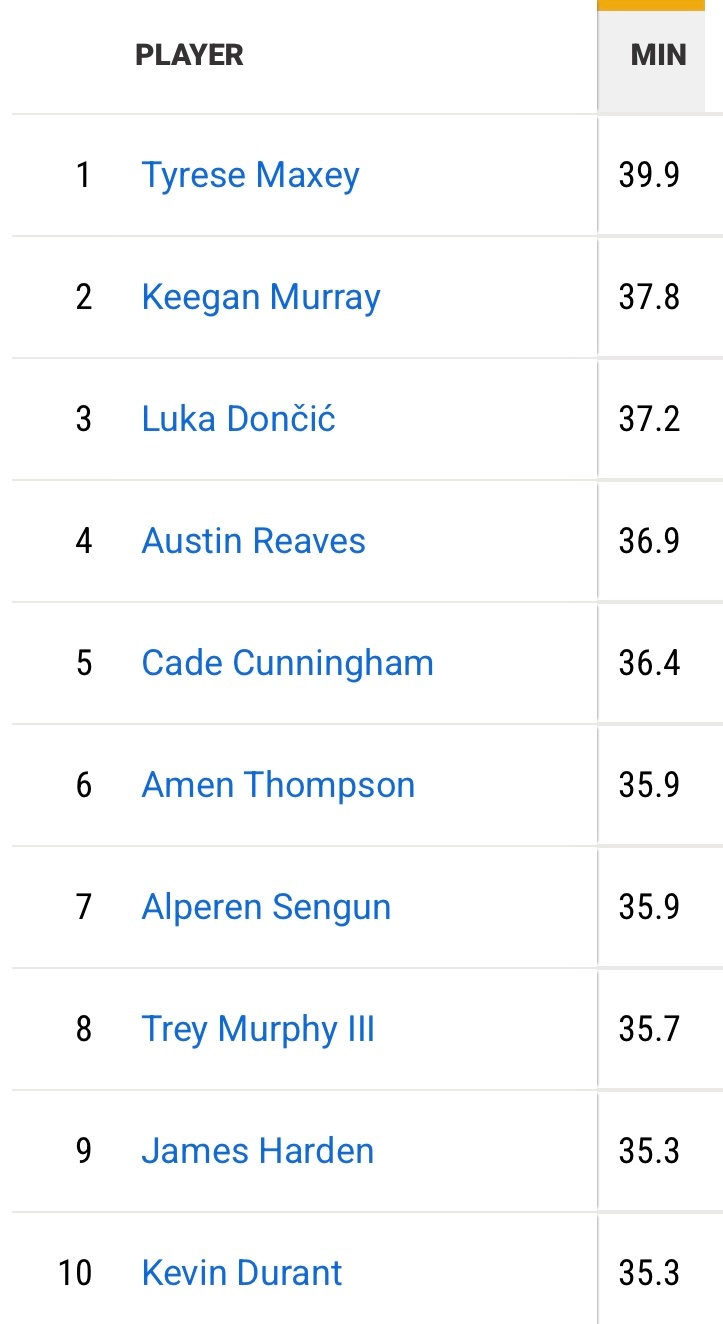 赛季至今场均上场时间前十的球员中,湖人占俩,东契奇37.2分钟第三,里夫斯36.9分钟第四。