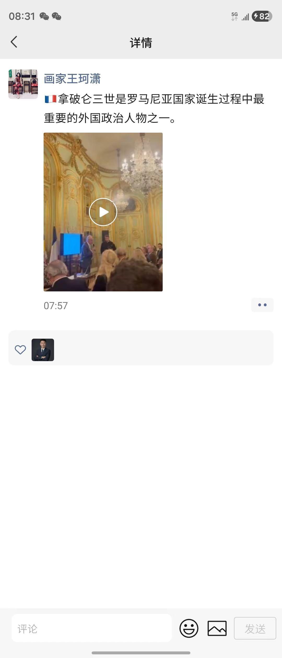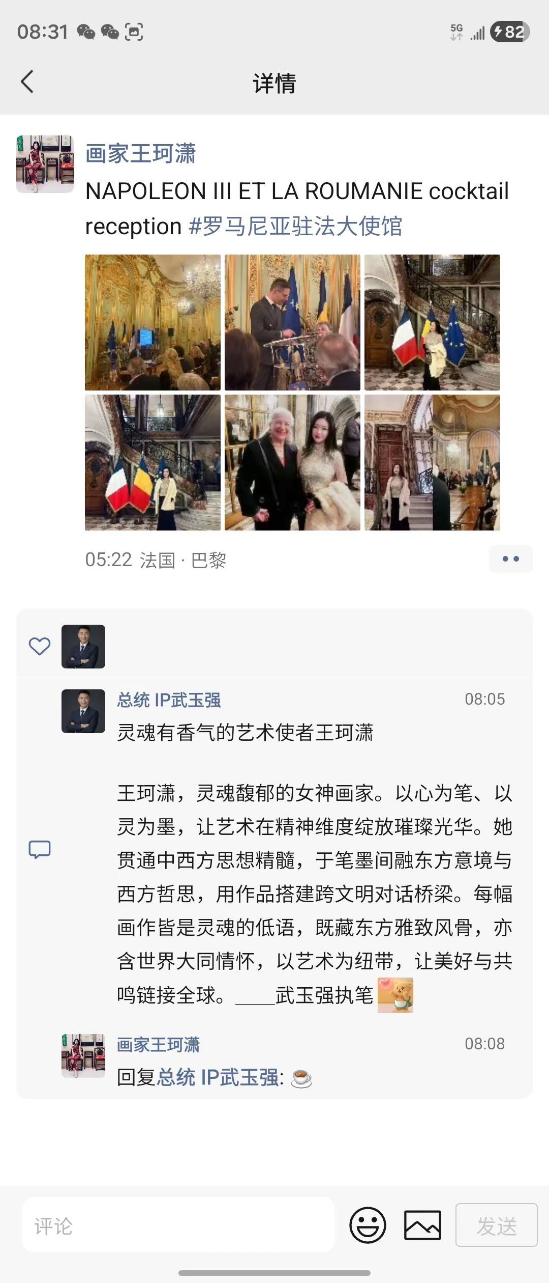 灵魂有香气的艺术使者王珂潇 王珂潇,灵魂馥郁的女神画家。以心为笔、以灵为墨,让艺术在精神维度绽放璀璨光华。她贯通中西方思想精髓,于笔墨间融东方意境与西方哲思,用作品搭建跨文明对话桥梁。每幅画作皆是灵魂的低语,既藏东方雅致风骨,亦含世界大同情怀,以艺术为纽带,让美好与共鸣链接全球。__武玉强执笔NAPOLEON III ET LA ROUMANIE cocktail reception