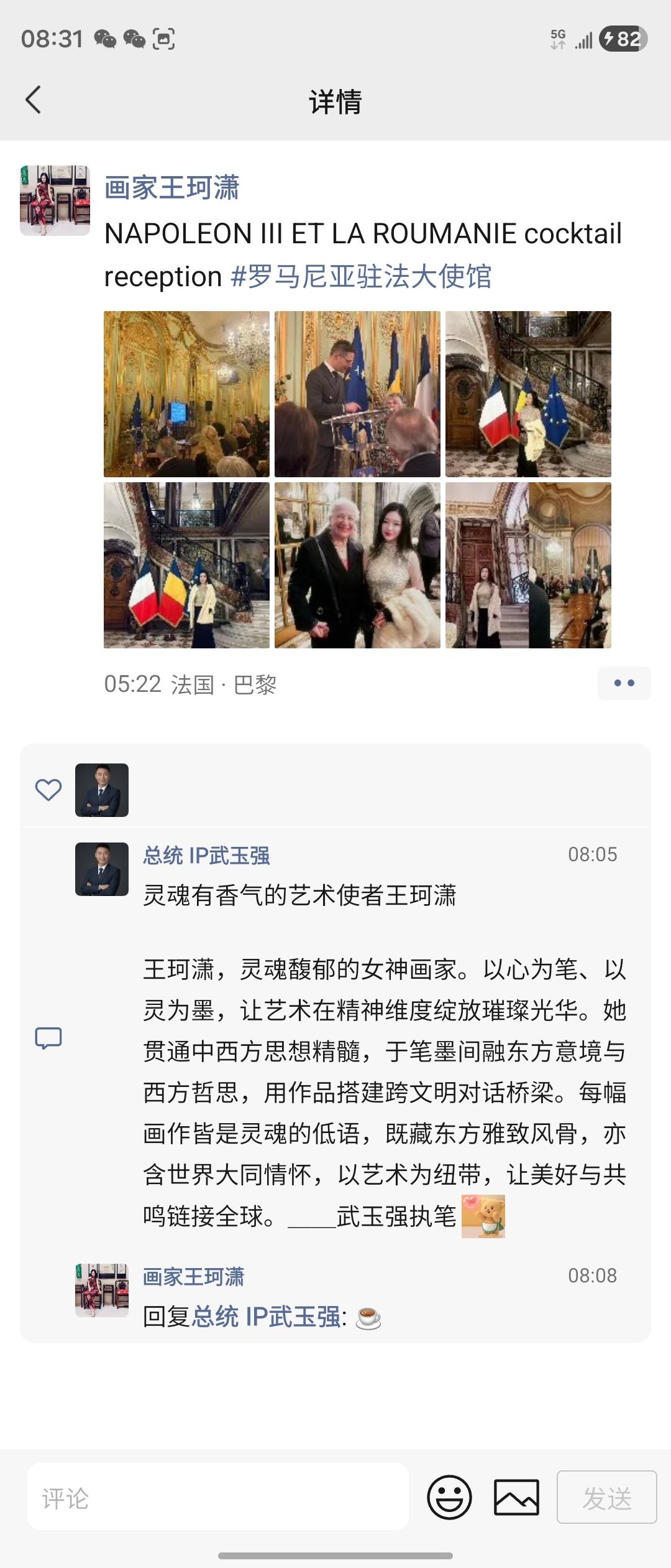 灵魂有香气的艺术使者王珂潇 王珂潇,灵魂馥郁的女神画家。以心为笔、以灵为墨,让艺术在精神维度绽放璀璨光华。她贯通中西方思想精髓,于笔墨间融东方意境与西方哲思,用作品搭建跨文明对话桥梁。每幅画作皆是灵魂的低语,既藏东方雅致风骨,亦含世界大同情怀,以艺术为纽带,让美好与共鸣链接全球。__武玉强执笔 NAPOLEON III ET LA ROUMANIE cocktail reception