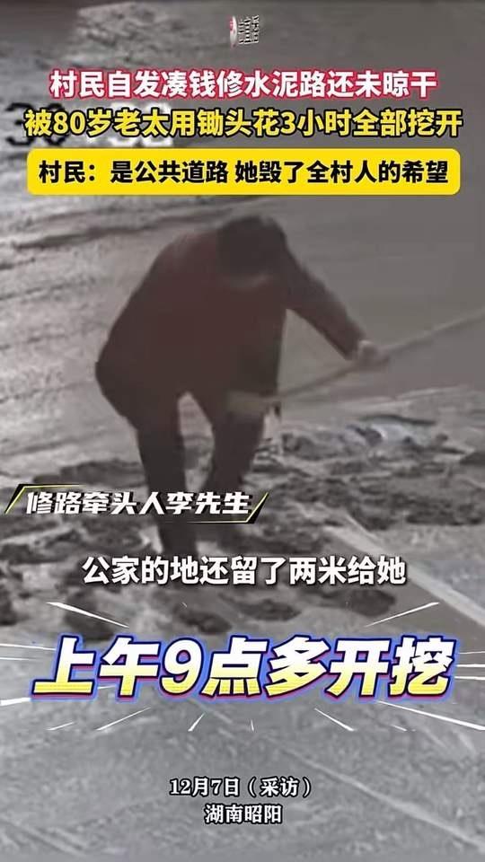 邵阳,村民自发凑钱修水泥路,结果水泥还没干,就被80岁老太太用锄头花3小