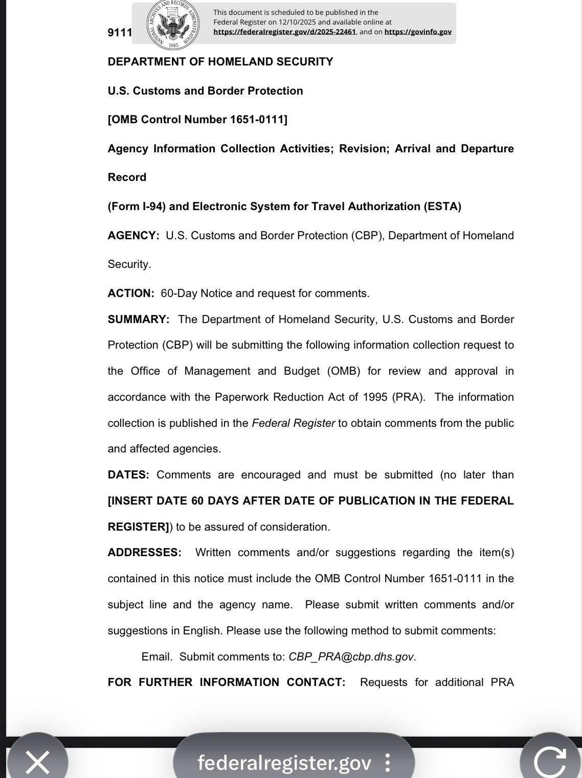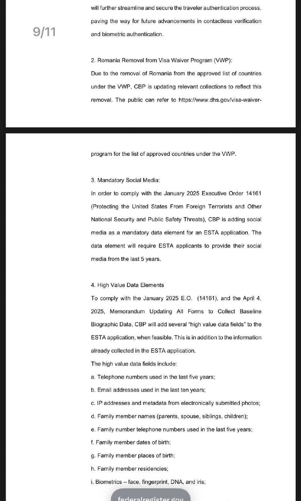 12月10日消息,官方公告显示,特朗普政府计划要求免签外国游客在入境美国前披露过去五年的社交媒体历史记录。这项提案于9日在《联邦公报》上发布,将适用于来自包括英国、法国、澳大利亚和日本在内42个国家的免签游客。 美国要看免签游客过去5年社媒记录 不只是社媒纪录哦。 作为符合 ESTA 资格的游客(即无需签证的游客,例如来自欧盟、英国、澳大利亚、日本和其他免签国家的游客),他们去美国未来可能还需要提供: - 所有生物识别信息:面部、指纹、DNA 和虹膜 - 过去 5 年的所有电话号码 - 过去 10 年的所有电子邮件地址 - 全家人的信息 …. 我以为是假消息,去美国国土安全局网站上查了一下,还真有。 虽然还未正式实施,但听上去也够离谱了。
