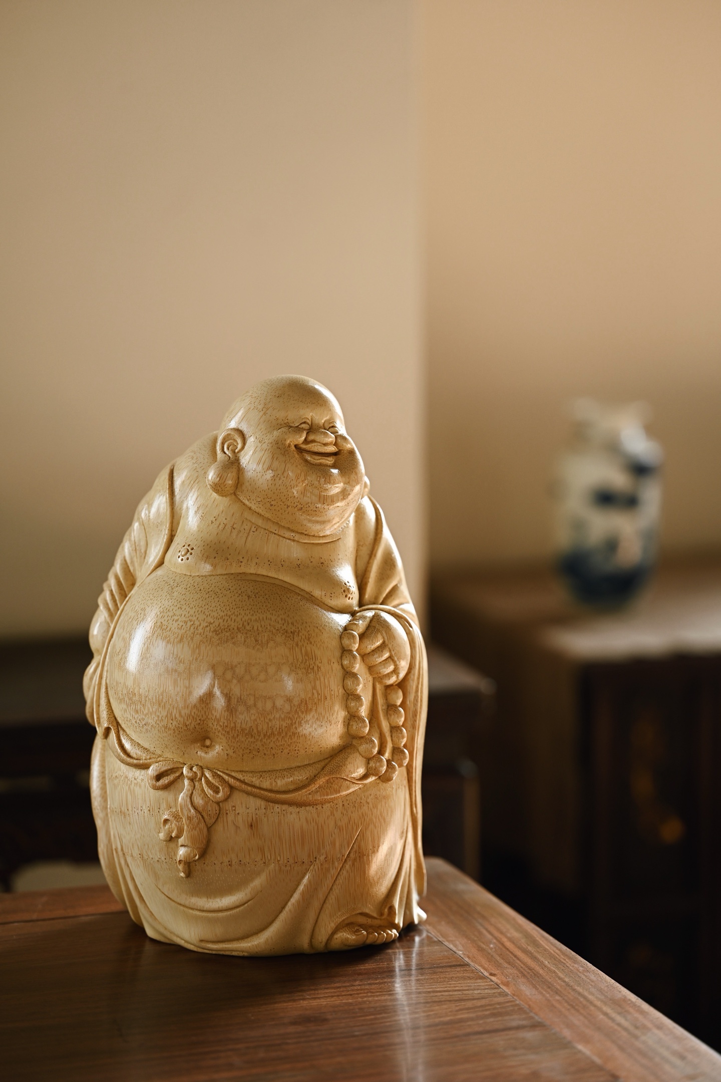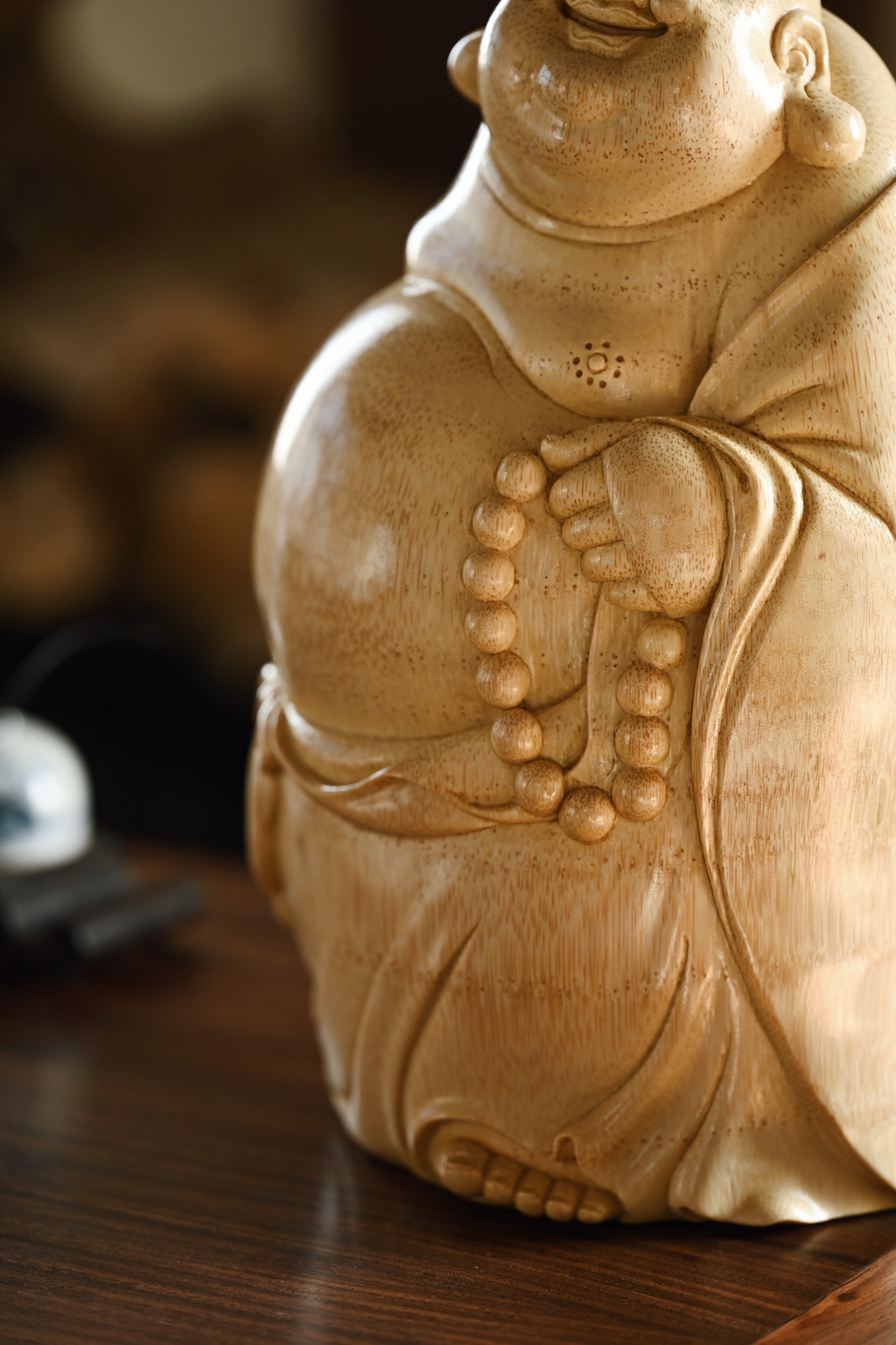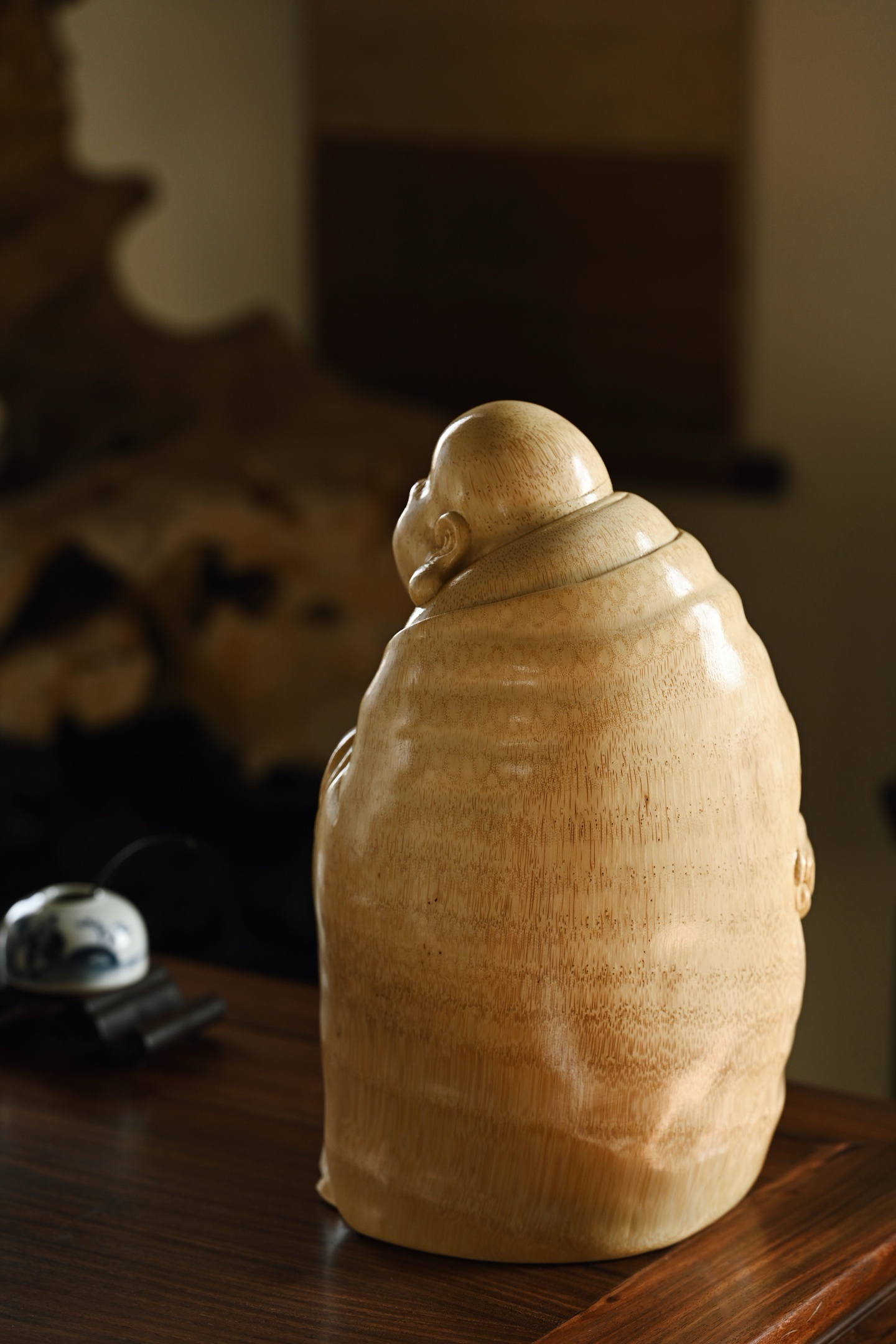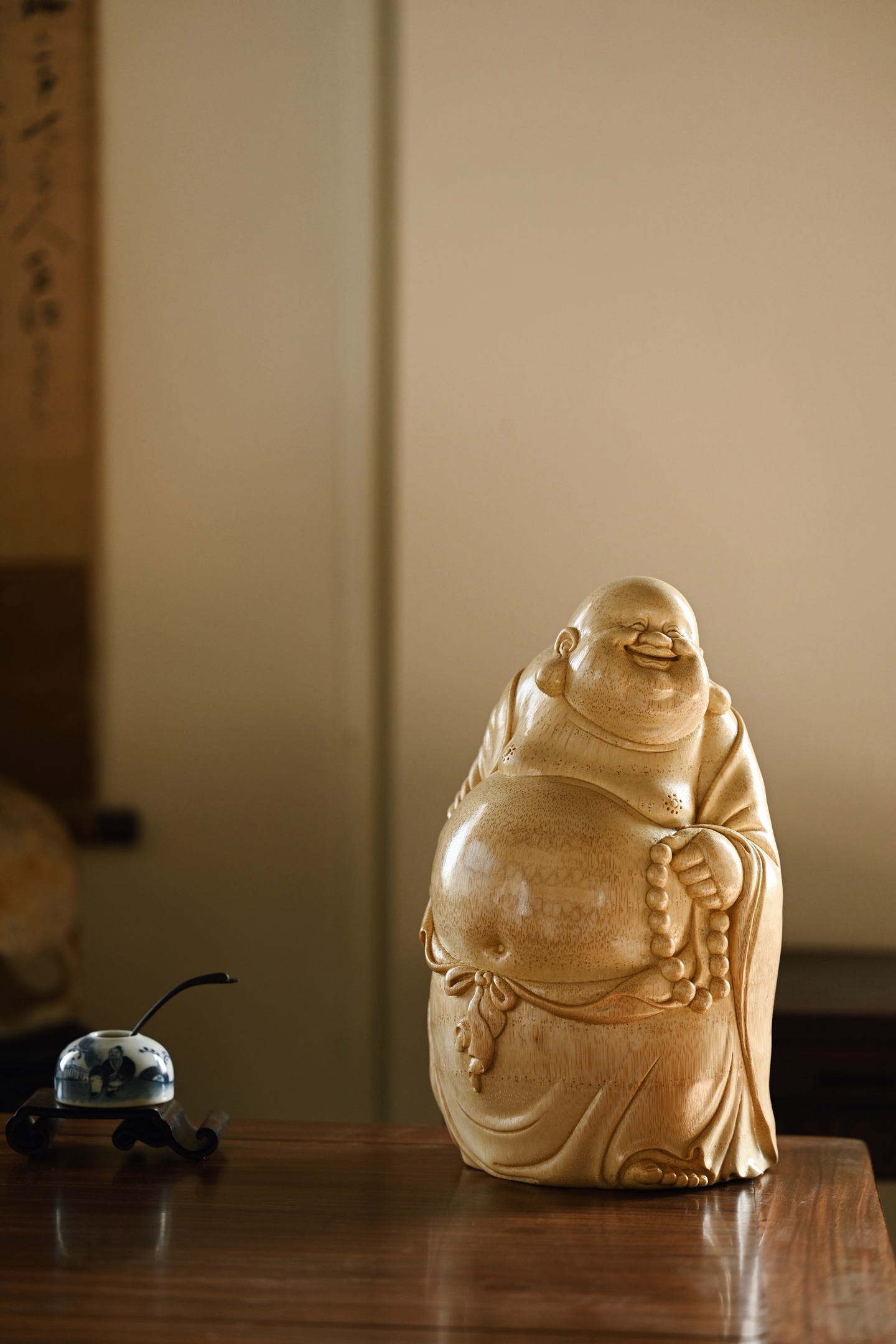 竹雕 | 弥勒佛弥勒形神相融,笑意欢喜豁达,一手持念珠,一手持布袋,既添俏皮灵动,又衬弥勒慈悲随和,憨态可掬。17.5*17*30cm 1462g
