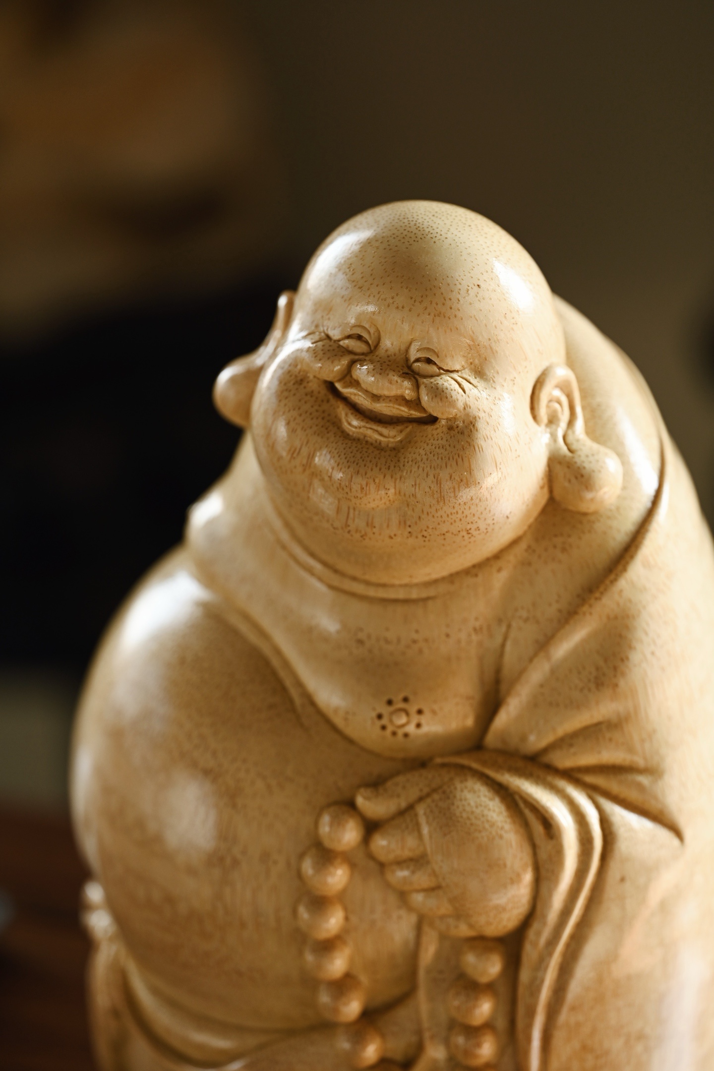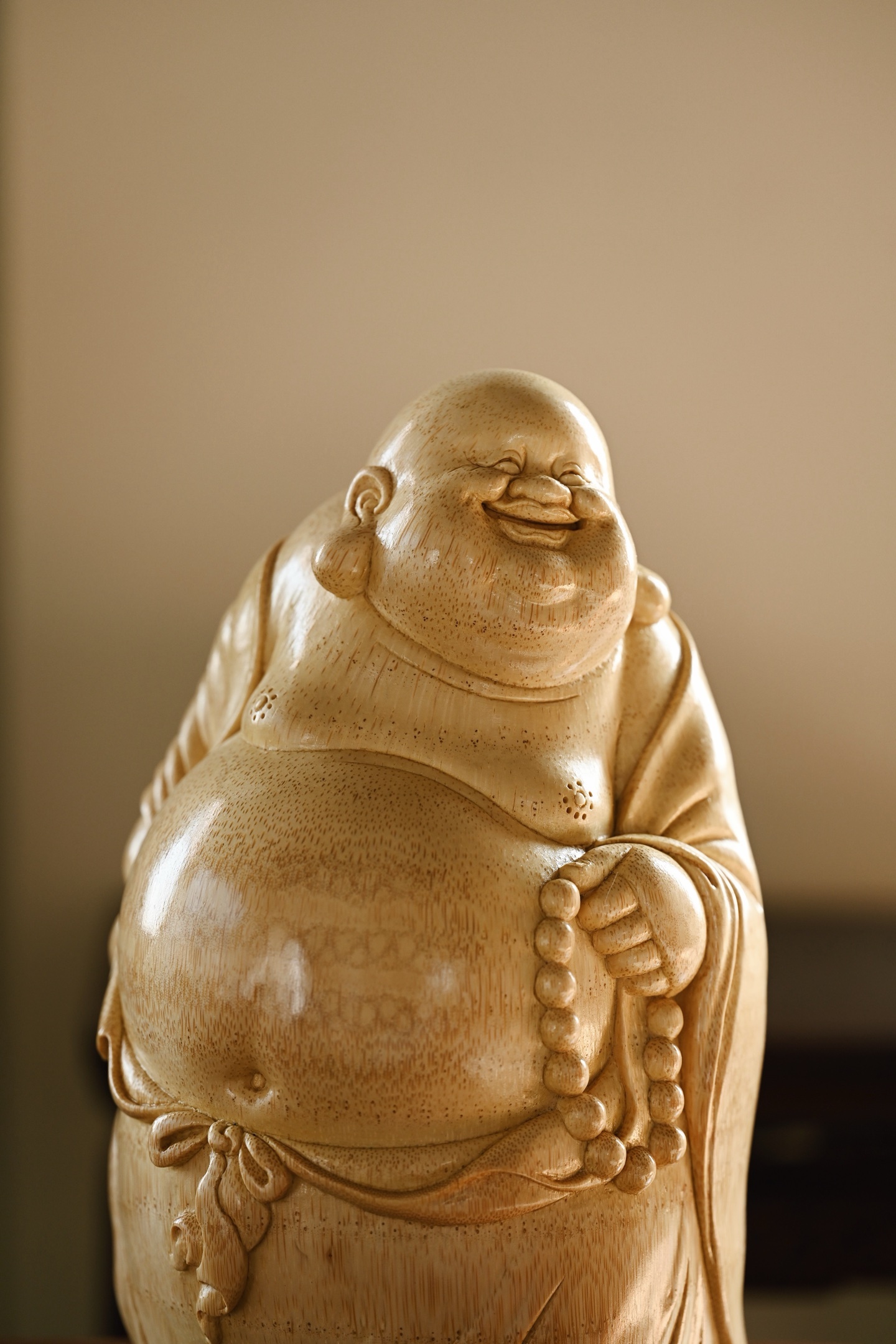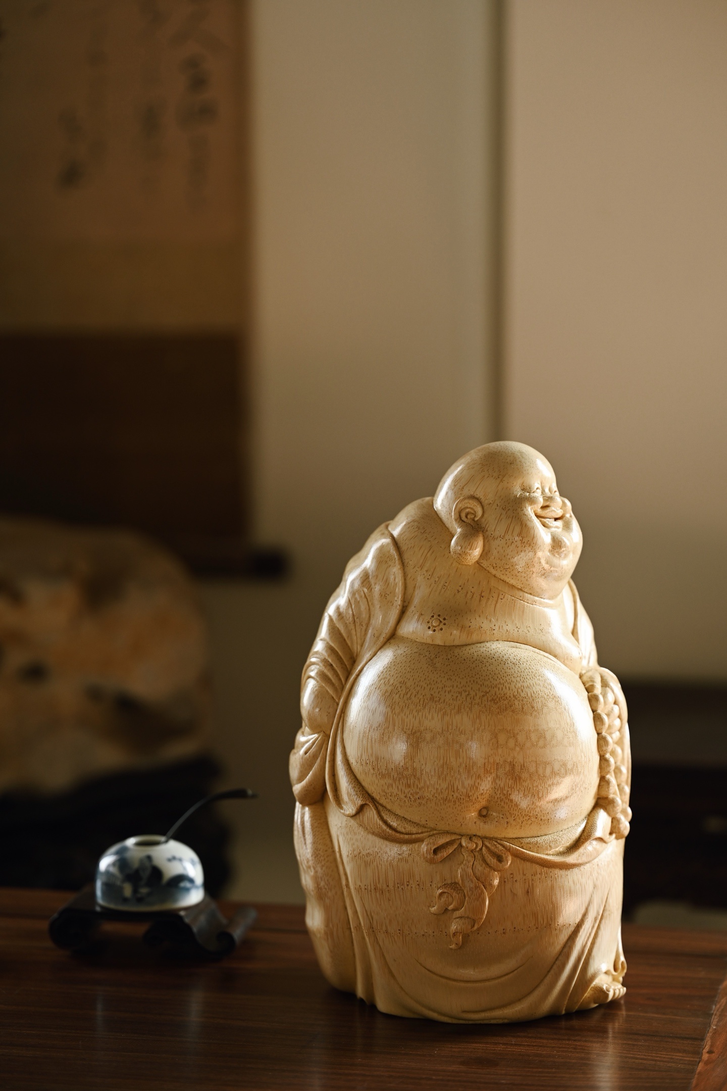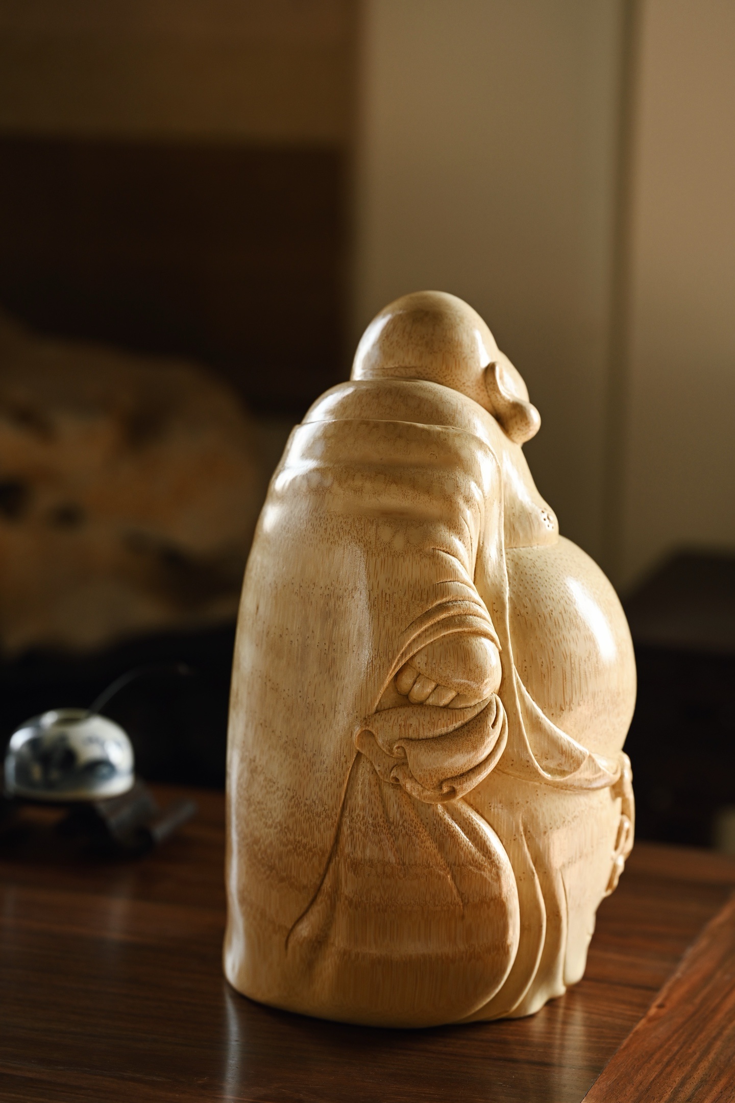 竹雕 | 弥勒佛弥勒形神相融,笑意欢喜豁达,一手持念珠,一手持布袋,既添俏皮灵动,又衬弥勒慈悲随和,憨态可掬。17.5*17*30cm 1462g