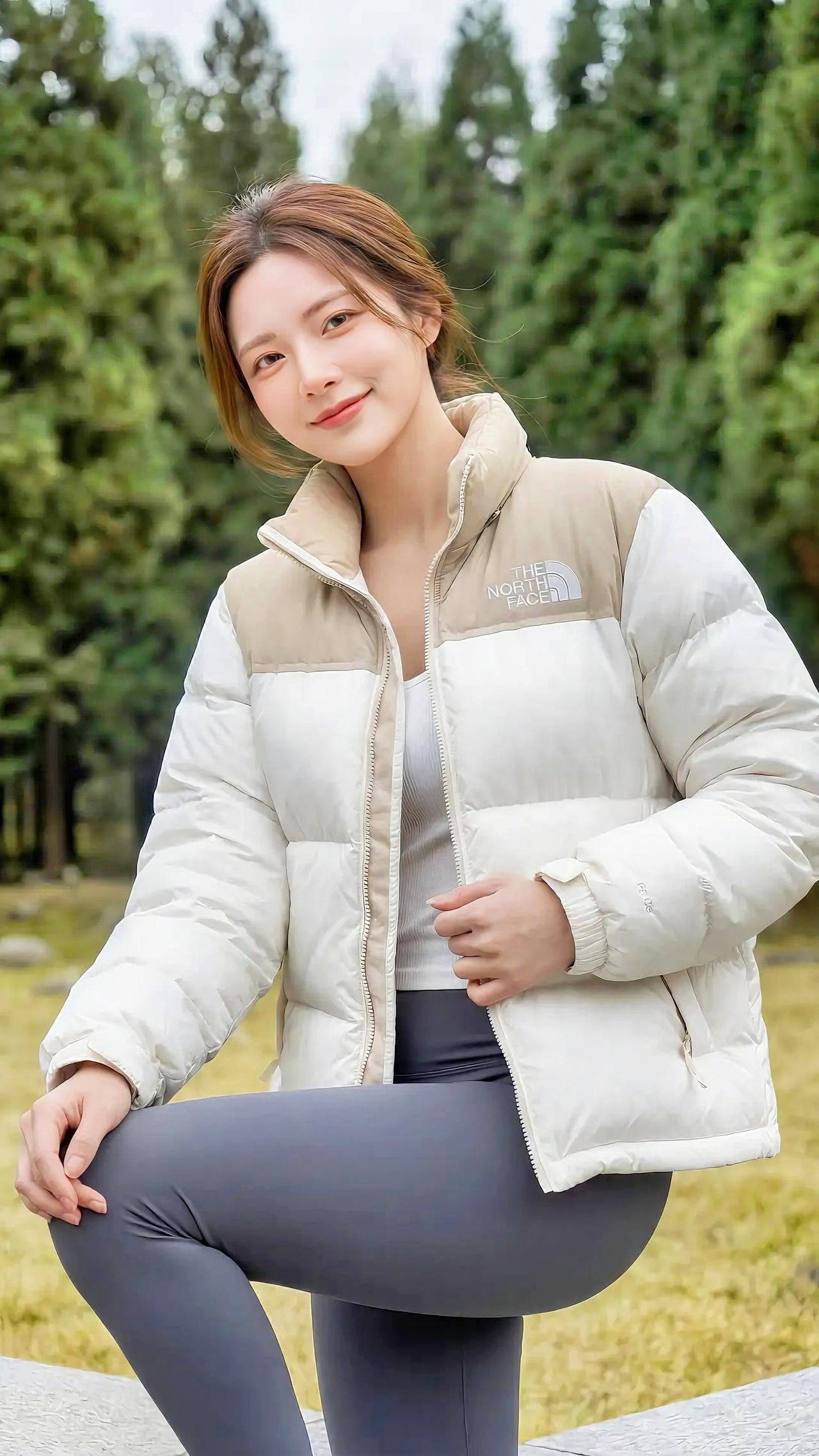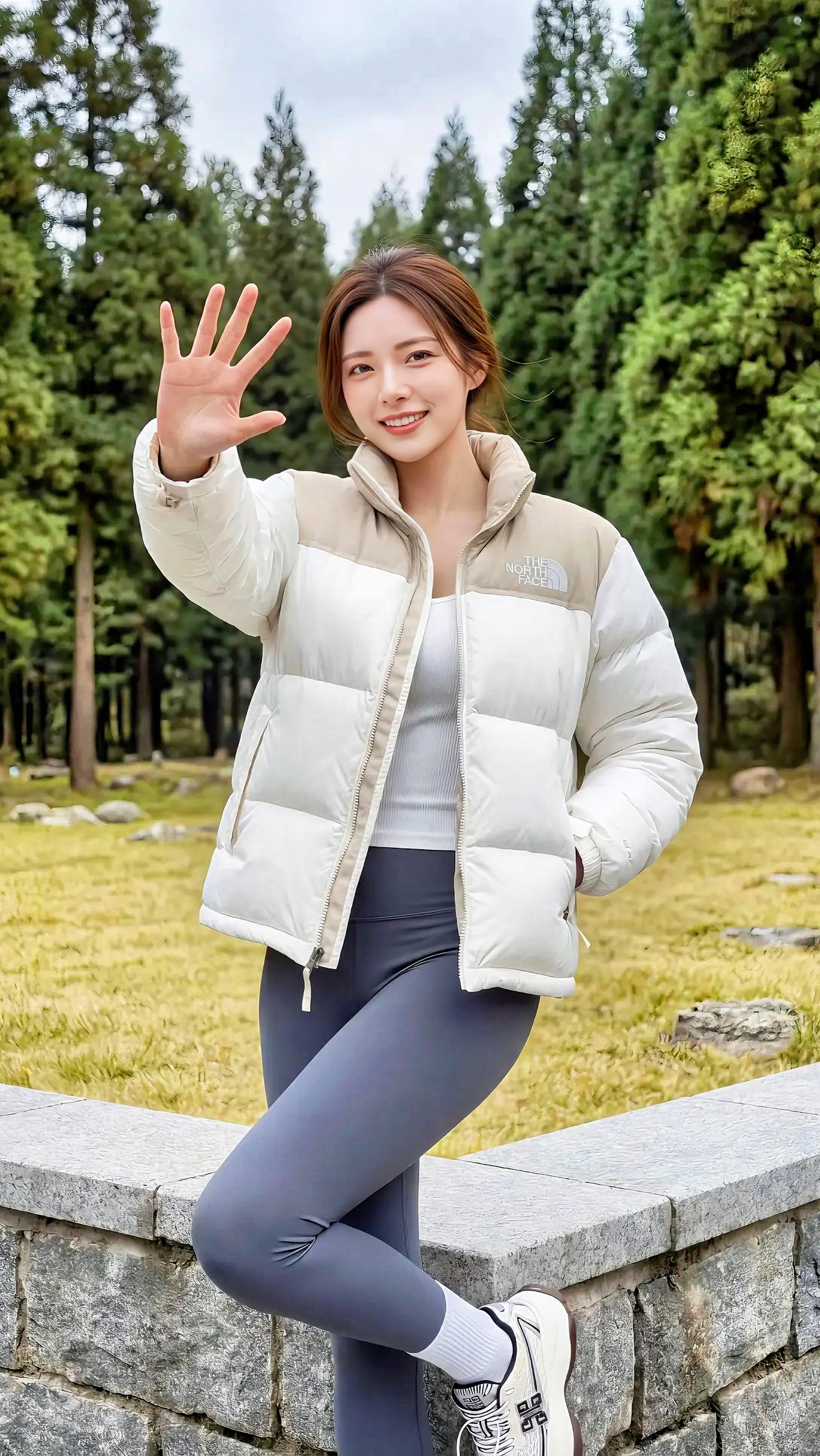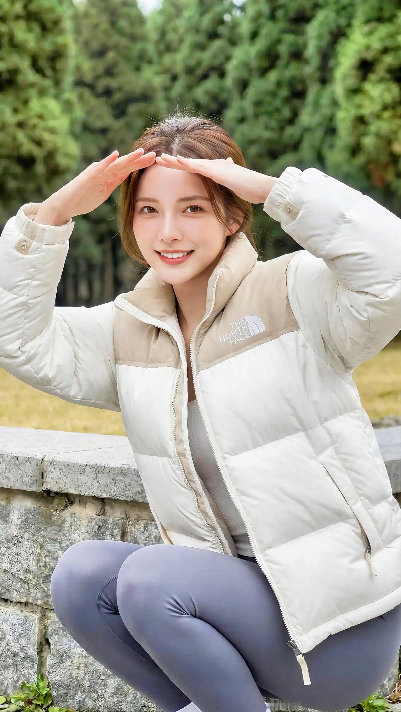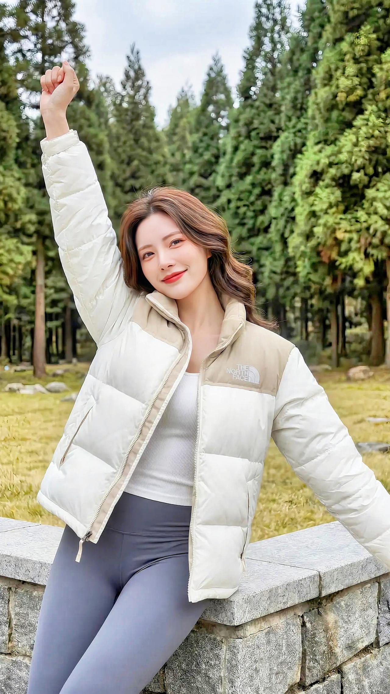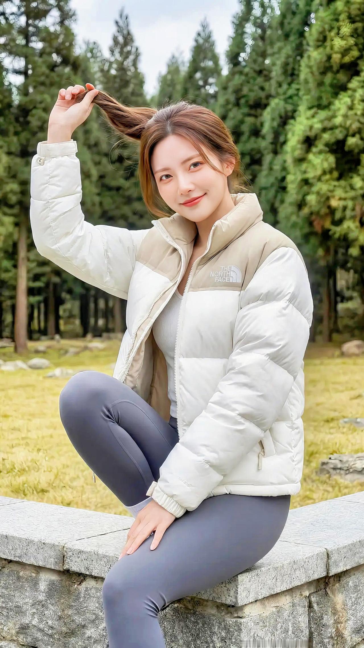 冬日森林中的甜美自拍,白色羽绒服与灰色紧身裤的完美搭配,温暖与时尚并存!🌲💕👗